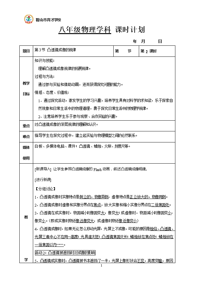 5.3凸透镜成像的规律(第2课时)--2021秋辽宁省鞍山市育才中学人教版八年级物理上册教学设计