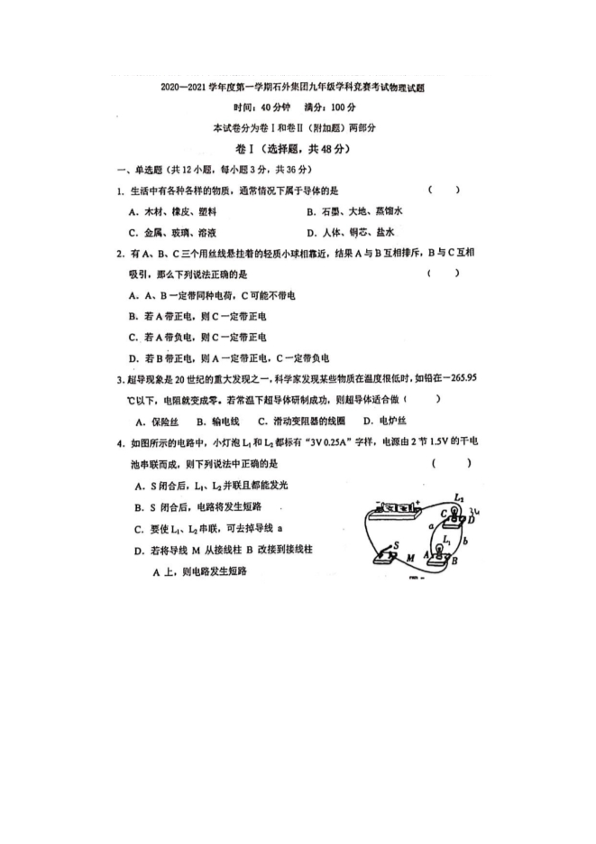 【内容简介】2020-2021学年度第一学期河北省石家庄外国语学校集团九年级学科竞赛考试物理试题及答案(扫描版)