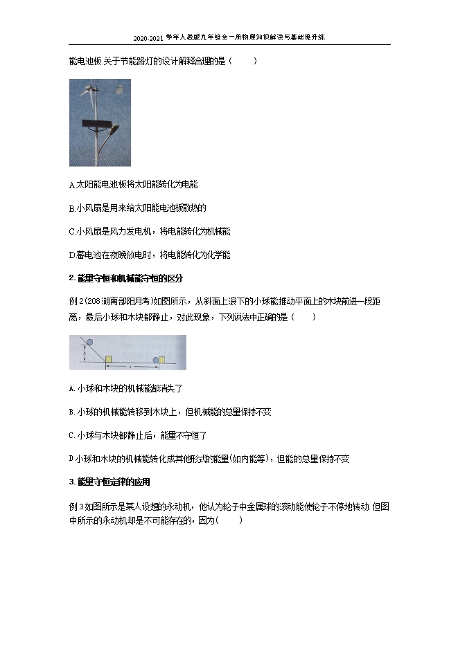 【内容简介】一、能量的转化和转移1.能量的存在形式自然界中存在着各种形式的运动,如机械运动、分子热运动、电磁运动等,每种运动都有一种形式的能跟它对应,因此能的形式多种多样跟机械运动对应的有机械能,跟分子热运动对应的有内能,跟电磁运动对应的有电磁能.此外,还有化学能、电能、光能等各种形式的能.2.能量的转化(1)在一定的条件下,自然界中的各种形式的能量可以相互转化(2)一些能量转化的实例:现象能量的转化摩擦生热机械能→内能水电站水轮机带动发电机发电机械能→电能电动机带动水泵将水抽到高处电能→机械能光合作用光能→化学能燃料燃烧发热化学能→内能太阳能热水器光能→内能太阳能电池光能→电能气体膨胀对外做功内能→机械能3.能量的转移能量可以从一个物体转移到另一个物体,也可以从物体的一部分转移到另一部分,在转移的过程中,能量的形式不变.例如,在热传递过程中,内能从高温物体转移到低温物体,或从物体的高温部分转移到低温部分,都属于能量的转移.二、能力守恒定律1.内容能量既不会凭空消灭,也不会凭空产生,它只会从一种形式转化为其他形式,或者从一个物体转移到其他物体,而在转化和转移的过程中,能量的总量保持不变,这就是能量守恒定律.2.对能量守恒定律的理解(1)能量守恒定律的普遍性:能量守恒定律是自然界最普遍、最重要的基本定律之一.自然界中的一切変化过程,小到原子核,大到宇宙天体,只要有能量转化,都遵循能量守恒定律(2)能量守恒定律包括“能量转化”和“能量转移”两个方面(3)不消耗能量就能够永远对外做功的机器一一永动机是不存在的,它违背了能量守恒定律,是不可能制成的.(4)能量守恒定律的成立是无条件的,一种形式的能量减少多少,其他形式的能量就会增加多少;能量从一个物体转移到另一个物体上,一个物体的能量减少了多少,另一个物体的能量就増加了多少,能量的总量保持不变. 1.判断能量的转化例1(2020秋•简阳市月考)如图所示,是一种新型节能路灯.它“头顶”小风扇,“肩扛”太阳能电池板.关于节能路灯的设计解释合理的是( ) A.太阳能电池板将太阳能转化为电能B.小风扇是用来给太阳能电池板散热的C.小风扇是风力发电机,将电能转化为机械能D.蓄电池在夜晚放电时,将电能转化为化学能解:这种新能源的路灯,“肩扛”大阳能电池板可以把阳能转化为 电能,所以A正确;小风扇的作用是把风能转化为电能,不是用来散热的所以B错误;“头顶”的小风扇可以把风能转化为电能,这样只要有风,这种路灯就可以发电,填补了一点阴天和晚上不能发电的空白,有利于路灯晚上照明使用,所以C错误;蓄电池在夜晚放电时,将化学能转化为电能,所以D错误,故正确答案为A.2.能量守恒和机械能守恒的区分例2(208湖南部阳月考)如图所示,从斜面上滚下的小球能推动平面上的木块前进一段距离,最后小球和木块都静止,对此现象,下列说法中正确的是( )