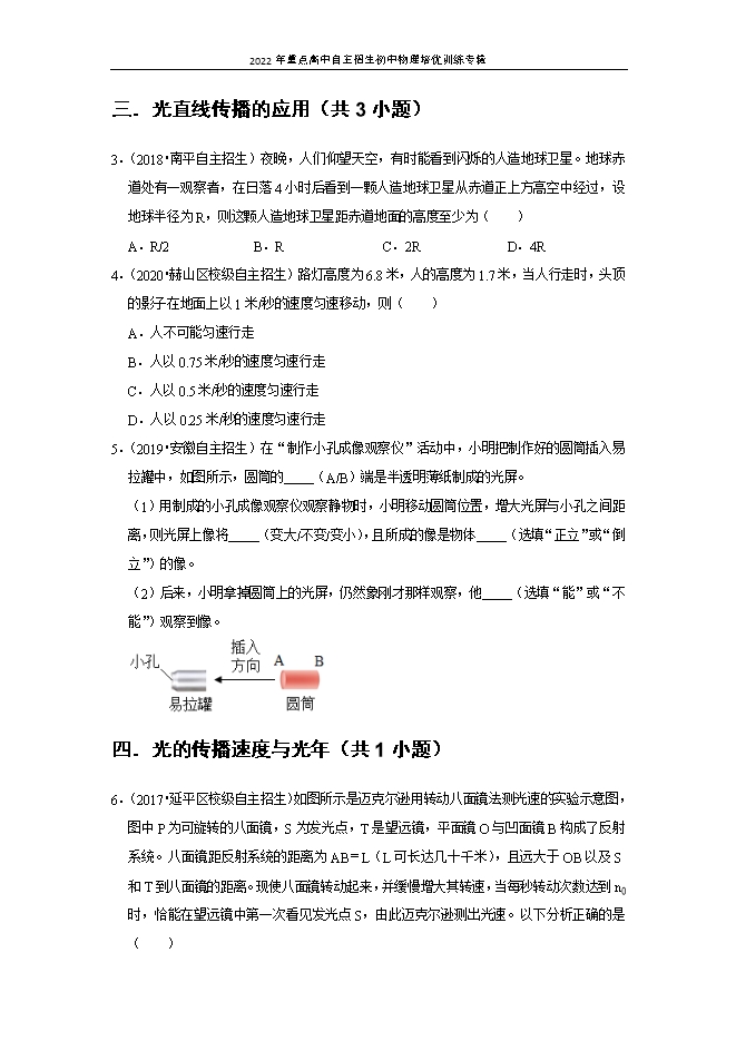 【内容简介】一.光源(共1小题)1.(2018•夏津县校级自主招生)以下有关光学知识的分析正确的是( )A.璀璨的宝石也是光源B.有一个完全潜入水中的人,看见岸边站着的另一个人感觉变矮了C.利用光的反射可以成像,利用光的折射可以成像,利用光的直线传播也可以成像D.“猴子捞月”的故事中,水中的月亮到水面的距离要远小于天上的月亮到水面的距离二.光在均匀介质中直线传播(共1小题)2.(2019•黄冈自主招生)今年1月31日晚,上海市民一饱眼福目睹“超级月亮、“红月亮和蓝月亮三碰头的罕见天文现象,上一次发生该天象还是在1866年3月31日,可谓百年一遇。下列对该现象的说法中正确的是( ) A.超级月亮是指该晚的月亮在当月中最明亮B.红月亮是指太阳光中的红光在地球大气层中的折射程度最强而导致月球表面呈现暗红色的现象C.蓝月亮是指太阳光中的蓝光在地球大气层中因受到散射的影响最小,通过大气层折射导致月球表面呈现淡蓝色的现象D.当天发生该现象时,月亮处于地球本影区即发生的是月全食现象三.光直线传播的应用(共3小题)3.(2018•南平自主招生)夜晚,人们仰望天空,有时能看到闪烁的人造地球卫星。地球赤道处有一观察者,在日落4小时后看到一颗人造地球卫星从赤道正上方高空中经过,设地球半径为R,则这颗人造地球卫星距赤道地面的高度至少为( )A.R/2B.RC.2RD.4R4.(2020•赫山区校级自主招生)路灯高度为6.8米,人的高度为1.7米,当人行走时,头顶的影子在地面上以1米/秒的速度匀速移动,则( )A.人不可能匀速行走B.人以0.75米/秒的速度匀速行走C.人以0.5米/秒的速度匀速行走D.人以0.25米/秒的速度匀速行走5.(2019•安徽自主招生)在“制作小孔成像观察仪”活动中,小明把制作好的圆筒插入易拉罐中,如图所示,圆筒的 (A/B)端是半透明薄纸制成的光屏。(1)用制成的小孔成像观察仪观察静物时,小明移动圆筒位置,增大光屏与小孔之间距离,则光屏上像将 (变大/不变/变小),且所成的像是物体 (选填“正立”或“倒立”)的像。(2)后来,小明拿掉圆筒上的光屏,仍然象刚才那样观察,他 (选填“能”或“不能”)观察到像。