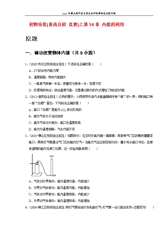 【内容简介】一.做功改变物体内能(共9小题)1.(2020•市北区校级自主招生)下述说法正确的是( )A.0℃的冰块内能为零B.温度越高,物体内能越大C.一瓶氧气用掉一半后,质量变为原来一半,密度不变D.反复弯折铁丝,铁丝温度升高,这是通过做功的方式增加了铁丝的内能2.(2012•宜宾自主招生)炎热的夏天,小雨同学开启汽水瓶盖瞬间伴有“嘭”的一声,同时瓶口有一股“白烟”冒出,下列说法正确的是( )A.瓶口“白烟”是瓶内CO2液化形成的B.瓶内气体分子运动加快C.瓶内气体对外做功,瓶口处温度降低D.瓶内外温度相等,汽水内能不变3.(2010•萧山区校级自主招生)如图所示,在空可乐瓶内滴一滴酒精,用装有气门芯的橡皮塞塞紧瓶口,再用打气筒通过气门芯向瓶内打气。当瓶内气压达到足够大时,塞子将从瓶口冲出,且原来透明的瓶内充满了白雾,这一实验现象表明( ) A.气体对外界做功,瓶内温度升高,内能减少B.外界对气体做功,瓶内温度升高,内能增加C.气体对外界做功,瓶内温度降低,内能减少D.外界对气体做功,瓶内温度降低,内能增加4.(2006•锦江区校级自主招生)用打气筒给自行车轮胎打气,打气筒一会儿就会发热,这是因为( )A.筒内气体对外做功,机械能减少,温度升高B.筒内气体对外做功,机械能增加,温度升高C.活塞克服摩擦做功,使筒内空气的内能增加D.迅速压缩活塞对筒内空气做功,使筒内空气的内能增加5.(2017•宁波自主招生)流星体与大气层剧烈摩擦,其表面温度可达8000℃以上,这个过程中,流星内能增加是通过 (填“做功”或“热传递”)实现的,汽油机工作过程中,实现这一能量转化的是 冲程。6.(2016•泗县校级自主招生)过春节时,同学们喜欢燃放鞭炮,一定要注意安全!有一种鞭炮,不需用火去点燃,只要稍用力将它甩向地面,鞭炮就可以爆响。鞭炮与地面发生碰撞时,通过 的方式,使它的内能 (“增大”或“减小”),这是 能转化为内能。7.(2010•龙子湖区校级自主招生)如图所示,密闭绝热容器内有一个绝热隔板(保证A、B间不发生热交换),隔板与容器之间无摩擦。隔板将A、B两部分气体隔开,当抽去销钉,发现隔板向右移动,则A中气体温度 ,B中气体温度 。(选填“升高”、“降低”、“不变”) 8.(2009•广德县校级自主招生)小明双手对搓后感觉手上发热,这是通过 的方式改变手的内能。汽油机的工作过程中,将机械能转化为内能的是 冲程。一台单缸四冲程汽油机,飞轮转速是1200r/min,该汽油机每秒钟内做功 次。9.(2020•市南区校级自主招生)如图所示,某同学做了一个气体膨胀的小实验,他将瓶盖的平滑顶部沾水,翻转后放在可口可乐瓶的瓶口。双手搓热,轻轻地将可乐瓶握实,几秒钟后,将会看到瓶盖在瓶口一直跳动。请你根据所学的物理知识,回答下列问题:(1)瓶盖沾水和不沾水两种情况, (选填“沾水”或“不沾水”)情况演示效果更好;(2)分别在夏天和冬天做这个实验,在 (选填“夏天”或“冬天”)效果会更好;(3)分别用小瓶(750毫升)和大瓶(2000毫升)做此实验,选 (选填“小瓶”或“大瓶”)实验效果更好。 二.热传递改变物体内能(共4小题)10.(2014•温州校级自主招生)下列过程,主要属于热传递改变物体内能的是( )A. 压缩气体B. 加热试管C. 电灯通电D. 小孩滑滑梯11.(2009•宜宾自主招生)下列属于通过热传递改变物体内能的实例是( )A.人类最早的取火方式﹣﹣“钻木取火”B.电热毯中的电阻丝通电后温度升高C.冬天,用热水袋取暖D.巨大的陨石堕入大气层后变成流星12.(2011•汕尾校级自主招生)搓手能使手暖和,这是用 的方式使手的内能增加;使用电热水器给水加热,这是用 的方式使水的内能增加。13.(2011•新都区校级自主招生)将一勺热水倒入量热器,假设没有热量散失,这时量热器中水温升高了 5℃,再加同样一勺水,水温又上升了3℃.问:(1)再加7勺同样的热水,则此量热器的水温还将上升多少?(2)如果不断地向量热器加同样的热水,量热器中最终水温比开始时升高了多少(假设量热器容积比勺的容积大得多)?三.燃料的热值及其计算(共3小题)14.(2009•蚌山区校级自主招生)一台效率为40%的柴油机,当输出3.44×107J有用功时,消耗的柴油质量是多少?( )(柴油的热值是4.3×107J/kg)A.0.8kgB.2kgC.0.32kgD.2.8kg15.(2019•涪城区校级自主招生)小汽车的发动机的排气量有的标有“1.8T“,有的标有“1.8L”。“T”表示“涡轮增压”,通过给发动机足量的空气来使汽油更允分地燃烧,因而比标“L”汽车发动机更节能,同样的汽油加在标”T”汽车发动机内和加在标”L“汽车发动机内,其热值 (选填“变大变小”或“不变”)。200g的汽油完全燃烧放出的热量是 J(q汽油=4.6×107J/kg)16.(2012•汕尾校级自主招生)碳的热值是3.0×107J/kg,表示 碳在完全燃烧的情况下放出的热量是3.0×107J,完全燃烧0.5kg的碳放出的热量为 J。四.热机的效率(共5小题)17.(2021•市北区校级自主招生)(1)如图1是汽车内燃机一个工作循环的四个冲程,一个工作循环的正确顺序是 ,其中图 所示冲程内燃机给汽车提供动力,若该内燃机转速为3600r/min,则每秒对外做功 次.(2)图2为某汽车内燃机的能量流向图,该内燃机的效率为 ;要提高这台内燃机的效率,可以采取的措施是 .