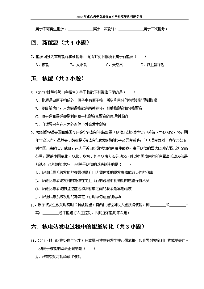 【内容简介】一.能量的转化与转移的方向性(共1小题)1.下列判断正确的是( )A.收音机里听到“咔咔擦擦”的声音,说明导线中有电流就能在周围产生电磁波B.微波炉是利用微波加热使食物内外同时变熟的,食物可以放在金属器皿中加热C.汽车散失的热不能自动收集起来再利用,说明能量的转化或转移具有方向性D.核电站的核反应就是利用核聚变原理二.能源(共1小题)2.地球上的液态水和固体水合计大约为14亿立方千米,其中淡水约占多少( )A.0.25%B.2.5%C.25%D.以上都不对三.能源的分类(共4小题)3.(2010•绵阳校级自主招生)电动自行车使用可重复充电的蓄电池提供动力。试分析电动自行车所消耗的能源属于①一次能源;②二次能源;③可再生能源;④不可再生能源;⑤常规能源;⑥新能源。( )A.②③⑤B.①③⑥C.②④⑥D.①④⑤4.(2017•陕西自主招生)2014年5月21日,中国与俄罗斯签署了总额高达4000亿美元的天然气贸易合同,俄罗斯向中方提供30年的天然气供应。天然气是 (选填“可”或“不可”)再生能源。目前城市公共汽车用天然气取代汽油做燃料是因为使用天然气相对减少了二氧化碳气体的排放,可以有效缓解 效应。通常采用 方法使天然气在常温下液化。5.(2014•北京校级自主招生)我们今天使用的煤、石油、天然气,它们属于 能源。(填“可再生”或“不可再生”)6.能源是人类社会生存和发展的重要物质,在你熟悉的能源中, 属于可再生能源; 属于不可再生能源; 属于一次能源; 属于二次能源。四.新能源(共1小题)7.能源可分为常规能源和新能源,请指出发下哪项不属于新能源( )A.核能B.太阳能C.天然气D.以上都不对五.核能(共3小题)8.(2007•蚌埠校级自主招生)关于核能下列说法正确的是( )A.物质是由原子构成的,原子中有原子核,所以利用任何物质都能得到核能B.到目前为止,人类获得核能有两种途径,即重核裂变和轻核聚变C.原子弹和氢弹都是利用原子核裂变和聚变的原理制成的D.自然界只有在人为的条件下才会发生裂变9.据新闻报道美国和韩国3月确定在朝鲜半岛部署「萨德」战区高空防卫系统(THAAD),预计明年年底运作,虽然美、韩称是反制朝鲜日益加强的核子及导弹威胁,但「项庄舞剑,意在沛公」,对中国带来的实际威胁,远大于近日纷纷扰扰的南海仲裁案。由于萨德的雷达侦测范围远达2000公里,覆盖中国东北、华北、华东、甚至华南大部分地区可以说中国境内的所有军事活动及部署都逃不了萨德的监控。下列关于萨德的说法错误的是( )A.萨德反导系统发射的核导弹是利用大量内能的爆发来造成毁灭性的伤害B.萨德反导系统发射的导弹在向上飞行的过程中机械能的总量保持不变C.萨德反导系统的监控雷达和发射车之间的联系是靠电磁波D.萨德反导系统发射的导弹在飞行时做匀速直线运动10.原子核发生改变时有时会释放能量。有两种途径可以大量获得核能,即 和 。其中 还不能进行人工控制,因此还不能用来发电。六.核电站发电过程中的能量转化(共3小题)11.(2011•蚌山区校级自主招生)日本福岛核电站发生核泄漏危机引起世界对安全利用核能的关注。下列关于核能的说法正确的是( )A.只有裂变才能释放出核能B.裂变和聚变都能释放出核能C.核能和电能都是二次能源D.核能和风能都是可再生能源12.目前,由于能源紧张,全国各地正在积极开发和利用新能源,如核电站和风力发电。其中核电站是利用原子核发生 (填“裂变”或“聚变”)来发电的,风能属于 (填“可再生”或“不可再生”)能源。13.我国已经建成了两座核电站。在那里,电能是由核 变时释放的 能转化来的,电能是从 机中得到的。七.核聚变(共2小题)14.(2011•南充自主招生)《不扩散核武器条约》缔约国第八次审议大会在纽约联合国总部召开,消除核武器与和平利用核能成为参会国讨论的焦点。关于原子弹与核电站的叙述正确的是( )A.原子弹对聚变的链式反应不加控制,核电站控制裂变的链式反应速率B.原子弹对聚变的链式反应不加控制,核电站控制聚变的链式反应速率C.原子弹对裂变的链式反应不加控制,核电站控制裂变的链式反应速率D.原子弹对裂变的链式反应不加控制,核电站控制聚变的链式反应速率15.(2008•江苏自主招生)人工释放原子能的方法是:一是重核发生 ;二是轻核发生 。