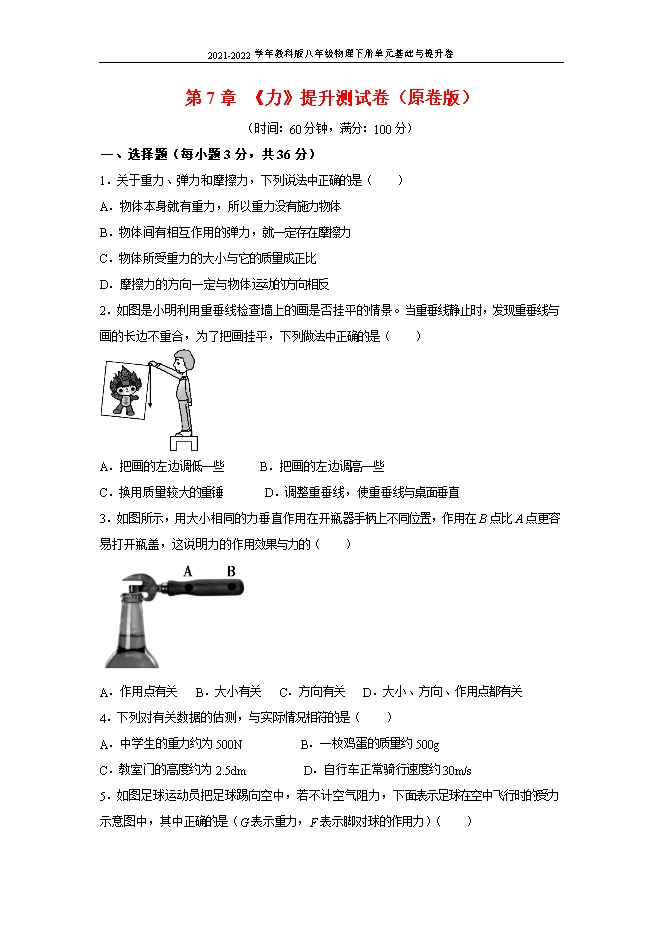 【内容简介】一、选择题(每小题3分,共36分)1.关于重力、弹力和摩擦力,下列说法中正确的是( )A.物体本身就有重力,所以重力没有施力物体B.物体间有相互作用的弹力,就一定存在摩擦力C.物体所受重力的大小与它的质量成正比D.摩擦力的方向一定与物体运动的方向相反2.如图是小明利用重垂线检查墙上的画是否挂平的情景。当重垂线静止时,发现重垂线与画的长边不重合,为了把画挂平,下列做法中正确的是( ) A.把画的左边调低一些 B.把画的左边调高一些C.换用质量较大的重锤 D.调整重垂线,使重垂线与桌面垂直3.如图所示,用大小相同的力垂直作用在开瓶器手柄上不同位置,作用在B点比A点更容易打开瓶盖,这说明力的作用效果与力的( ) A.作用点有关 B.大小有关 C.方向有关 D.大小、方向、作用点都有关4.下列对有关数据的估测,与实际情况相符的是( )A.中学生的重力约为500N B.一枚鸡蛋的质量约500gC.教室门的高度约为2.5dm D.自行车正常骑行速度约30m/s5.如图足球运动员把足球踢向空中,若不计空气阻力,下面表示足球在空中飞行时的受力示意图中,其中正确的是(G表示重力,F表示脚对球的作用力)( ) A. B. C. D. 6.如图,在探究滑动摩擦力的大小与哪些因素有关的实验中,小龙将弹簧测力计圆环固定在墙上,挂钩挂着木块,木块下面是一长木板,实验时用F=20N的拉力拉着长木板在粗糙水平面上向左做直线运动,经过3s移动了60cm。则( )①实验时必须匀速拉动长木板②长木板受到的重力和地面对长木板的支持力是一对平衡力③弹簧测力计的示数小于20N④A所受支持力等于A的重力 A.只有①②正确B.只有③④正确C.只有①③正确D.只有②④正确7.如图,在光滑的水平面上叠放着甲、乙两个木块,甲木块用一根细绳拴在左边固定的竖直墙上,现在用F=20N的力把木块乙从右端匀速地抽出来,则甲、乙两木块所受的摩擦力是( ) A.甲和乙都受向左20N的摩擦力B.甲和乙都受向右20N 的摩擦力C.甲受向右20N的摩擦力,乙受向左20N的摩擦力D.甲没有受到摩擦力,乙受向右的20N的摩擦力8.如图所示,剩有部分饮料的易拉罐倾斜静止在水平桌面上,则易拉罐水平方向受力和受到的重力图,正确的是( )