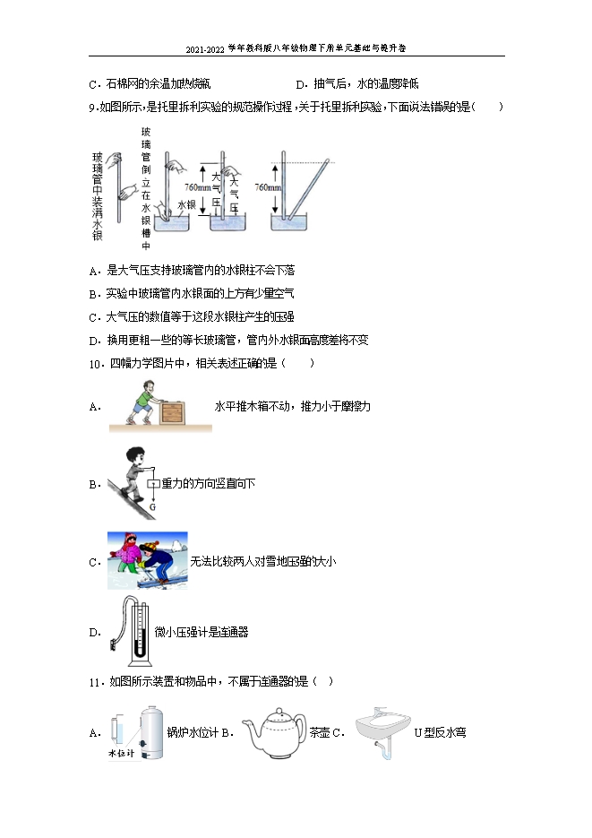 2021-2022学年教科版八年级物理下册单元基础与提升卷:第9章 压强 基础卷(原卷和解析版)