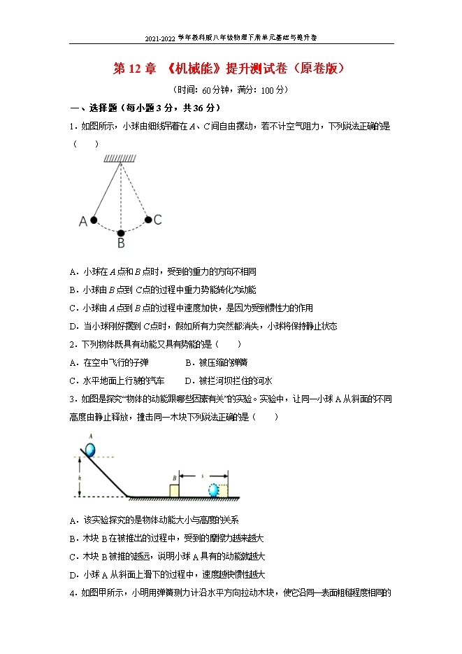 【内容简介】1.如图所示,小球由细线吊着在A、C间自由摆动,若不计空气阻力,下列说法正确的是( )A.小球在A点和B点时,受到的重力的方向不相同B.小球由B点到C点的过程中重力势能转化为动能C.小球由A点到B点的过程中速度加快,是因为受到惯性力的作用D.当小球刚好摆到C点时,假如所有力突然都消失,小球将保持静止状态【答案】D【解析】A.小球在A点和B点时,受到的重力的方向相同,都是竖直向下的,故A错误;B.小球由B点到C点的过程中,质量不变、速度减小、高度增大,则小球的动能减小,重力势能增大,所以,在此过程中动能转化为重力势能,故B错误;C.小球由A点到B点的过程中速度加快,是因为受到重力的作用,其运动状态发生改变,惯性是一种性质,不是力,故C错误;D.当小球刚好摆到C点时,速度为零,假如所有力突然都消失,根据牛顿第一定律可知,小球将保持静止状态,故D正确。故选D。2.下列物体既具有动能又具有势能的是( )A.在空中飞行的子弹 B.被压缩的弹簧C.水平地面上行驶的汽车 D.被拦河坝拦住的河水【答案】A【解析】A.在空中飞行的子弹,有高度也有速度,所以具有动能和重力势能,故符合题意;B.被压缩的弹簧,弹簧发生弹性形变,具有弹性势能,故不符合题意;C.在水平地面上行驶的汽车,有速度无高度,所以只具有动能,故不符合题意;D.被拦河坝拦住的河水,有高度无速度,所以只具有重力势能,故不符合题意。 故选A。3.如图是探究“物体的动能跟哪些因素有关”的实验。实验中,让同一小球A从斜面的不同高度由静止释放,撞击同一木块下列说法正确的是( ) A.该实验探究的是物体动能大小与高度的关系B.木块B在被推出的过程中,受到的摩擦力越来越大C.木块B被推的越远,说明小球A具有的动能就越大D.小球A从斜面上滑下的过程中,速度越快惯性越大【答案】C【解析】A.同一小球质量一定,从斜面的不同高度由静止释放,滑到水平面上时的速度不同,所以这是为了探究物体动能与速度关系的,故A错误;B.木块B在被推出的过程中,因压力大小和接触面粗糙程度不变,故受到的摩擦力不变,B错误;C.实验中通过小球把木块推出的距离长度来反应小球的动能的大小,木块B被推的越远,说明小球A具有的动能就越大,故C正确;D.物体的惯性大小只决定于物体的质量,与其它因素无关,小球A从斜面上滑下的过程中,惯性不变,故D错误。故选C。4.如图甲所示,小明用弹簧测力计沿水平方向拉动木块,使它沿同一表面粗糙程度相同的水平木板滑动,如图乙是他两次拉动同一木块得到的距离随时间变化的图像,下列说法正确的是( ) A.木块两次具有的动能一样大B.两次拉力对木块做功一样多C.木块第一次受到的拉力较大D.第一次拉力做功的功率较大【答案】D【解析】A.由图乙知,两次物体都做匀速直线运动,第一次物体的速度较大,所以第一次物体的动能较大,故A错误;B.从图乙中可以看出,在相同拉力作用下,木块两次运动的距离不同,所以木块两次所做的功不同,由W=Fs可知,但是在没有指出是相同时间内,因此不能比较二者做功多少,故B错误;C.由A分析知,接触面粗糙程度、受到的压力不变,木块两次受到的拉力相等,故C错误;D.从图乙中可以看出第一次木块运动的速度较大,由功率的变形公式P=Fv可知,力F相同,第一次速度v大,所以功率大,故D正确。故选D。