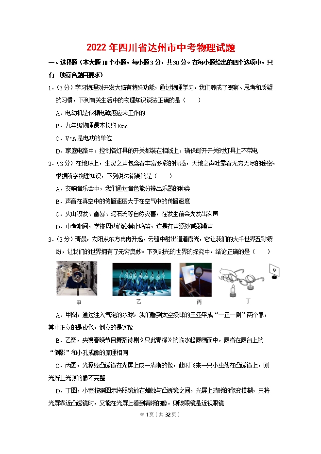 【内容简介】1.(3分)学习物理对开发大脑有特殊功能,通过物理学习,我们养成了观察、思考和质疑的习惯,下列有关生活中的物理知识说法正确的是( )A.电动机是依据电磁感应来工作的B.九年级物理课本长约8cmC.V•A是电功的单位D.家庭电路中,控制各灯具的开关都装在相线上,确保断开开关时灯具上不带电2.(3分)在地球上,生灵之声包含着丰富多彩的情感,天地之声吐露着无穷无尽的秘密,根据所学物理知识,下列说法错误的是( )A.交响音乐会中,我们通过音色能分辨出乐器的种类B.声音在真空中的传播速度大于在空气中的传播速度C.火山喷发、雷暴、泥石流等自然灾害,在发生前会先发出次声D.中考期间,学校周边道路禁止鸣笛,这是在声源处减弱噪声3.(3分)清晨,太阳从东方冉冉升起,云缝中射出道道霞光,它让我们的大千世界五彩缤纷,让我们的世界拥有了无穷奥妙。下列对光的世界的探究中,结论正确的是( ) A.甲图,通过注入气泡的水球,我们看到太空授课的王亚平成“一正一倒”两个像,其中正立的是虚像,倒立的是实像B.乙图,央视春晚节目舞蹈诗剧《只此青绿》的临水起舞画面中,舞者在舞台上的“倒影”和小孔成像的原理相同C.丙图,光源经凸透镜在光屏上成一清晰的像,此时飞来一只小虫落在凸透镜上,则光屏上光源的像不完整D.丁图,小薇按照图示将眼镜放在蜡烛与凸透镜之间,光屏上清晰的像变模糊,只将光屏靠近凸透镜时,又能在光屏上看到清晰的像,则该眼镜是近视眼镜4.(3分)热学世界真了不起,揭开了隐藏在物质世界深处的秘密,瓦特发明的蒸汽机推动了第一次工业革命……。下列有关热现象描述正确的是( )A.物体吸收热量后内能一定增大,温度一定升高B.不同物质组成的质量相同的物体,放出同样多的热量时,降温较多的物体其物质比热容较大C.柴油机在吸气冲程中吸入汽缸的是柴油和空气的混合物D.登山运动员在高山上用高压锅煮饭,是因为高山上气压小,液体沸点低,米饭不易煮熟5.(3分)物理学的许多概念来自于生产、生活,人们对力的认识也是从日常生活开始的。下列对力学知识认识正确的是( )A.微小压强计是利用连通器原理工作的B.鸡蛋碰碗,蛋破而碗不破说明相互作用力大小不相等C.空间站处于失重状态,因此宇航员在空间站里无法展示“泪如雨下”的现象D.探究“重力与质量的关系”实验时,使弹簧测力计的弹簧伸长的力是钩码的重力6.(3分)如图所示,小华用滑轮组水平向左匀速拉动A物体,A物体5s内移动了100cm,且A物体与水平地面的摩擦力大小为12N,已知滑轮组的机械效率为80%,则下列说法错误的是( )