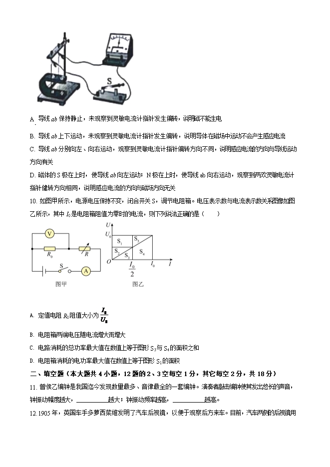 【内容简介】1. 下列说法不正确的是( )A. 大庆的冬天,树上经常有美丽的“雾淞”,这是凝固现象B. 大庆的冬天,交管部门向积雪的道路撒盐是为了降低雪的熔点C. 流体在流速大的地方压强较小D. 加热热气球气袋中的空气,会使热气球内部气体的温度升高,密度降低2. 小明不慎将一瓶矿泉水从二楼阳台滑落,忽略空气阻力,则这瓶矿泉水在下落过程中的路程与时间关系图像正确的是( )A. B. C. D. 3. 关于以下四幅图说法正确的是( ) A. 甲图中体温计可以直接测量火焰温度B. 乙图说明做功可以改变物体的内能C. 丙图中a孔接零线D. 丁图是正确 读数方式4. 下列说法正确的是( )A. 起瓶器(俗称“瓶起子”)是费力杠杆B. 岸边人看水中鱼的位置比实际要浅一些,是由光的反射造成的C. 晶体熔化过程中吸收热量,温度升高D. 将铜片和锌片分开插入同一西红柿中,就可以制成一个简易的西红柿电池5. 如图,将一瓶500mL的纯净水倒置在水平桌面上,它对桌面的压强最接近下面哪个数据( ) A. 1×102PaB. 1×104PaC. 1×106PaD. 1×108Pa6. 历史上关于光的本性的认识主要有两种观点:一种是以牛顿为代表的“微粒说”;另一种是以托马斯·杨为代表的“波动说”,即认为光是一种波。下列史实符合科学精神的是( )A. 鉴于牛顿在力学方面的伟大成就,所以“微粒说”一定是对的B. 由于大多数科学家支持牛顿的观点,所以“微粒说”一定是对的C. 泊松以“波动说”为基础,结合数学知识推导出听起来特别荒谬的结果,所以“波动说”是错的D. 托马斯·杨用实验证实了光具有波独有的特性,所以“波动说”是正确的7. 雨滴从高空沿直线竖直下落,由于空气阻力的作用,雨滴先加速后匀速运动,可认为雨滴受到的空气阻力与速度的平方成正比,且比例系数不变。关于雨滴下落过程中下列说法正确的是( )A. 匀速下落时,质量大的雨滴速度比质量小的雨滴速度大B. 雨滴一直处于平衡状态C. 雨滴下落过程中机械能保持不变D. 雨滴只有在加速下落过程中才有力对它做功8. 如图所示,将一体积为 质量分布均匀的正方体木块轻轻放入一盛满某种液体的溢水杯中,溢出液体的体积为 ;若将木块从中间锯掉一半,将剩余部分再次轻轻放入装满该液体的溢水杯中,则该液体会溢出( ) A. B. C. D. 9. 某同学利用如图所示的实验装置探究电磁感应现象,实验时开关S始终闭合且磁体保持静止,下列探究过程及结论均合理的是( )