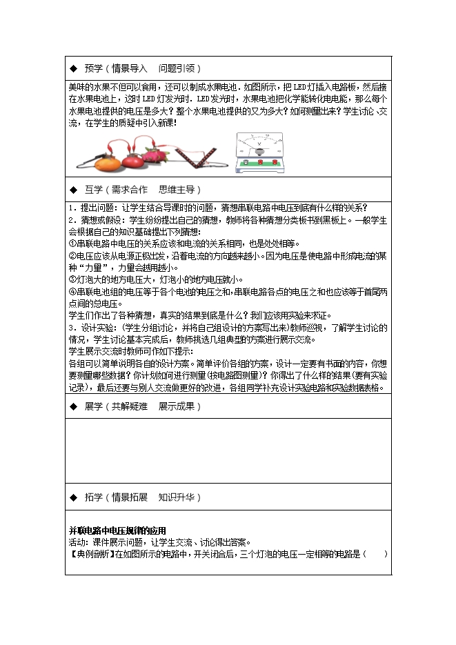 【内容简介】预学(情景导入 问题引领)美味的水果不但可以食用,还可以制成水果电池.如图所示,把LED灯插入电路板,然后接在水果电池上,这时LED灯发光时.LED发光时,水果电池把化学能转化电电能,那么每个水果电池提供的电压是多大?整个水果电池提供的又为多大?如何测量出来?学生讨论、交流,在学生的质疑中引入新课! 互学(需求合作 思维主导)1.提出问题:让学生结合导课时的问题,猜想串联电路中电压到底有什么样的关系?2.猜想或假设:学生纷纷提出自己的猜想,教师将各种猜想分类板书到黑板上。一般学生会根据自己的知识基础提出下列猜想:①串联电路中电压的关系应该和电流的关系相同,也是处处相等。②电压应该从电源正极出发,沿着电流的方向越来越小。因为电压是使电路中形成电流的某种“力量”,力量会越用越小。③灯泡大的地方电压大,灯泡小的地方电压就小。④串联电池组的电压等于各个电池的电压之和,串联电路各点的电压之和也应该等于首尾两点间的总电压。学生们作出了各种猜想,真实的结果到底是什么?我们应该用实验来求证。3.设计实验:(学生分组讨论,并将自己组设计的方案写出来)教师巡视,了解学生讨论的情况,学生讨论基本完成后,教师挑选几组典型的方案进行展示交流。学生展示交流时教师可作如下提示:各组可以简单说明各自的设计方案。简单评价各组的方案,设计一定要有书面的内容,你想要测量哪些数据?你计划如何进行测量(按电路图测量)?你得出了什么样的结果(要有实验记录),最后还要与别人交流做更好的改进,各组同学补充设计实验电路和实验数据表格。