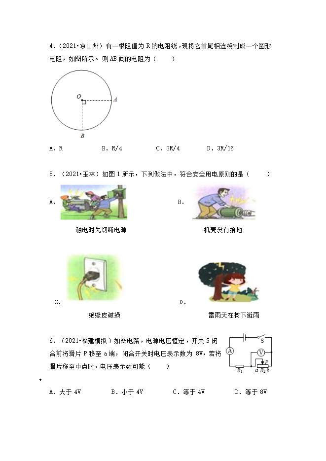 【内容简介】1.(2021•福建模拟)关于安全用电,下列做法正确的是( )A.多个大功率用电器同时使用一个插座B.将冰箱金属外壳接地C.电路开关接在零线上D.用湿布擦拭通电的用电器2.(2021•长沙模拟)志愿者小亮经常为社区老人家里更换灯泡,如图所示,下列操作流程符合安全用电原则的是( )A.站上木凳→更换灯泡→切断电源→通电测试B.切断电源→站上木凳→更换灯泡→通电测试C.更换灯泡→切断电源→摘下灯罩→通电测试D.摘下灯罩→切断电源→更换灯泡→通电测试3.如图所示的装置是一款在家庭电路中使用的定时插线板,相应参数为“10A-MAX 250V~”,该插线板具有当用电器充满电时自动切断电路的功能,也可以按照所我们设计的时间给用电器供电。关于定时插线板下列说法正确的是( )A.插线板上多个插座是串联关系B.正常情况下,该插线板上有2个插孔会使检测的试电笔氖管发光C.不能将功率为2300W的用电器与该插座连接使用D.插座内只有火线和零线两根导线4.(2021•凉山州)有一根阻值为R的电阻线,现将它首尾相连绕制成一个圆形电阻,如图所示。则AB间的电阻为( ) A.R B.R/4 C.3R/4 D.3R/165.(2021•玉林)如图1所示,下列做法中,符合安全用电原则的是( )A. B. 触电时先切断电源 机壳没有接地C. D. 绝缘皮破损 雷雨天在树下避雨6.(2021•福建模拟)如图电路,电源电压恒定,开关S闭合前将滑片P移至a端,闭合开关时电压表示数为8V,若将滑片移至中点时,电压表示数可能( )•A.大于4VB.小于4VC.等于4VD.等于8V