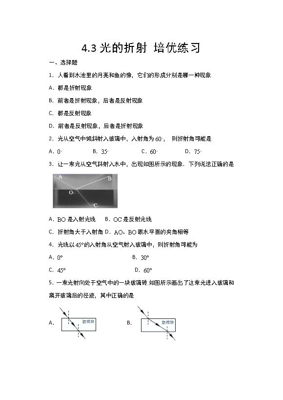 【内容简介】1.人看到水池里的月亮和鱼的像,它们的形成分别是哪一种现象A.都是折射现象 B.前者是折射现象,后者是反射现象C.都是反射现象 D.前者是反射现象,后者是折射现象2.光从空气中倾斜射入玻璃中,入射角为60。, 则折射角可能是A.0。 B.35。 C.60。 D.75。3.让一束光从空气斜射入水中,出现如图所示的现象.下列说法正确的是 A.BO是入射光线B.OC是反射光线C.折射角大于入射角D.AO、BO跟水平面的夹角相等4.光线以45°的入射角从空气射入玻璃中,则折射角可能为A.0° B.30° C.45° D.60°5.一束光射向处于空气中的一块玻璃砖.如图所示画出了这束光进入玻璃和离开玻璃后的径迹,其中正确的是A. B. C. D. 6.小李把一个硬币放在碗里,移动碗直到眼睛看不到为止,保持头部不动往碗里倒水 ,水倒到一定程度时,小李又重新看到硬币。下列四种作图方法中能正确说明上述现象的是A. B. C. D. 7.将刻度尺斜插入水中,从水面上看去,水中尺子的刻度情况( )A.变得疏了 B.变得密了 C.一部分变疏一部分变密 D.疏密没有变化8.当光由空气射入水中时,以下说法中正确的是( )A.折射光线一定向远离法线的方向偏折 B.光线一定发生折射C.折射角一定小于入射角 D.折射角等于或小于入射角9.陶瓷茶杯底部放有一枚硬币,人移动到某一位置时看不到硬币(如图甲所示)。人位置不变,往茶杯中倒入一些水后,又能看到硬币了(如图乙所示),这主要是由于( )