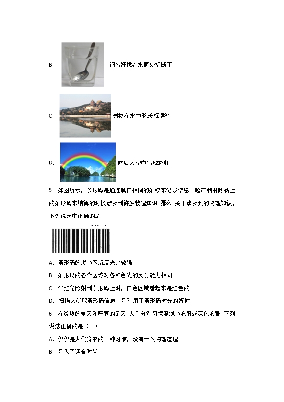 【内容简介】1.伟大物理学家牛顿最早发现了光的色散现象,它属于A.光的直线传播 B.光的反射C.光的折射 D.平面镜成像2.如图所示的彩色电视机的荧屏上呈现各种颜色,都是由三种基本色光混合而成的,这三种基本色光是 A.红、橙、黄 B.橙、靛、紫C.绿、蓝、红 D.黄、绿、蓝3.关于光的色散,下列说法不正确的是A.白光通过棱镜后,传播方向发生改变B.色散现象表明白光是由多种色光组成的C.红色光通过三棱镜时,传播方向不发生改变D.蓝色光通过三棱镜时,不会产生色散现象4.如图所示的现象中,属于光的色散现象的是A. 日环食B. 钢勺好像在水面处折断了C. 景物在水中形成“倒影”D. 雨后天空中出现彩虹5.如图所示,条形码是通过黑白相间的条纹来记录信息.超市利用商品上的条形码来结算的时候涉及到许多物理知识.那么,关于涉及到的物理知识,下列说法中正确的是A.条形码的黑色区域反光比较强B.条形码的各个区域对各种色光的反射能力相同C.当红光照射到条形码上时,白色区域看起来是红色的D.扫描仪获取条形码信息,是利用了条形码对光的折射6.在炎热的夏天和严寒的冬天,人们分别习惯穿浅色衣服或深色衣服,下列说法正确的是( )A.仅仅是人们穿衣的一种习惯,没有什么物理道理B.是为了迎合时尚C.浅色的衣服更易反射光,不致于吸光太多而发热;深色的衣服吸光更强,产生更多的热量,便于取暖防寒D.浅色衣服和深色衣服反射光、吸收光的本领一样.......