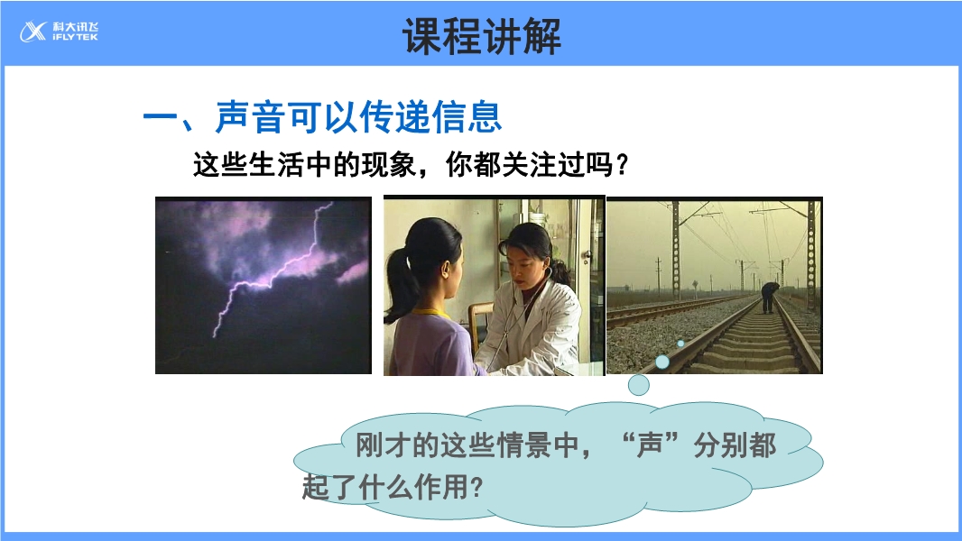【内容简介】一、引入新课生活中可能有很多关于声音的利用的事件,但我们可能没有在意,譬如说吧:隆隆的雷声预示着一场大雨即将来临。那么,除此之外你所见到的生活中关于声的利用的事例还有哪些?二、自主学习 合作探究探究活动(一)声与信息教师活动1问:你能举出声运用的例子吗?学生活动1学生思考后回答:医生通过听诊器了解病人的心跳的情况;铁路工人利用铁锤敲击钢轨,会从异常的声音中发现松动的螺丝;利用声音识别同学;听新闻知天下大事......教师活动2问:很好!下面请同学们阅读课本第38—39页,看看能不能把声与信息分分类,看看有几种运用?指导学生科学的阅读课文。学生活动2阅读课文,尝试分类。汇报声与信息的运用。初步分类。小组合作,交流归纳:1.在日常生活、工业、军事、医疗等方面的运用分类。2.按声音、超声波、次声波的运用分类。【设计意图】 很多学生并不会阅读,更不会对阅读材料剖析分类。这部分内容之所以这样处理,就是要培养学生的基本学习能力,还能发现本节的易混点。