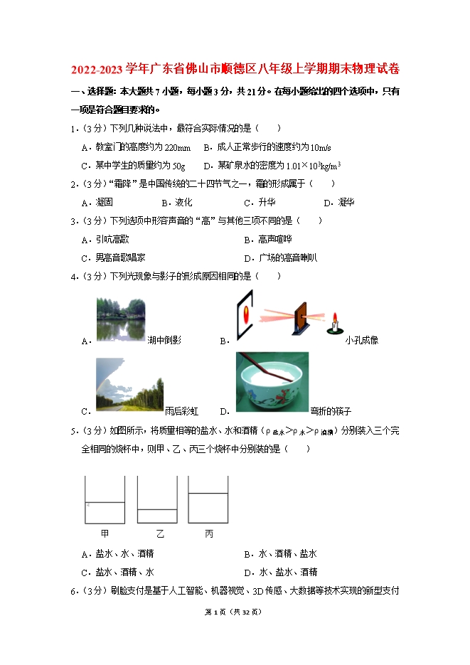 【内容简介】1.(3分)下列几种说法中,最符合实际情况的是( )A.教室门的高度约为220mmB.成人正常步行的速度约为10m/sC.某中学生的质量约为50g D.某矿泉水的密度为1.01×103kg/m32.(3分)“霜降”是中国传统的二十四节气之一,霜的形成属于( )A.凝固B.液化C.升华D.凝华3.(3分)下列选项中形容声音的“高”与其他三项不同的是( )A.引吭高歌B.高声喧哗C.男高音歌唱家D.广场的高音喇叭4.(3分)下列光现象与影子的形成原因相同的是( )A. 湖中倒影 B. 小孔成像C. 雨后彩虹 D. 弯折的筷子5.(3分)如图所示,将质量相等的盐水、水和酒精(ρ盐水>ρ水>ρ酒精)分别装入三个完全相同的烧杯中,则甲、乙、丙三个烧杯中分别装的是( ) A.盐水、水、酒精B.水、酒精、盐水C.盐水、酒精、水D.水、盐水、酒精6.(3分)刷脸支付是基于人工智能、机器视觉、3D传感、大数据等技术实现的新型支付方式,在刷脸支付过程中需要使用到摄像头进行拍摄,下列说法正确的是( ) A.摄像头成像原理与投影仪相同B.人到镜头距离小于镜头两倍焦距C.所成的像是缩小的像 D.当人往镜头靠近时,成的像变小7.(3分)A、B两个物体同时同地向东做直线运动,如图所示的两个图象分别描述了A、B两个物体的运动情况,下列说法正确的是( ) A.A物体的速度大于B物体的速度 B.B物体的速度一直增大C.A物体运动3s通过的距离是3m D.B物体运动3s通过的距离是4m二、填空题:本大题共7小题,每空1分,共21分。8.(3分)如图所示体温计的分度值为 ℃,量程为 ℃;若没有甩就用它来测量实际体温为36.8℃的某同学的体温,则体温计的示数为 ℃。