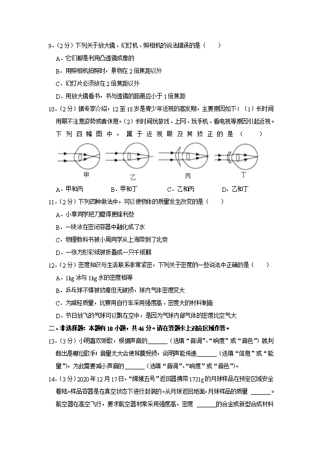 【内容简介】1.(2分)估测是学生学好物理的一项基本能力,小聪对与自己身边生活相关的一些物理量进行了估测,其中最符合实际的是( )A.八年级物理课本的长度约为26dmB.早上升旗时放一遍国歌时间约5minC.初中生跑完100m用时约为7sD.一只篮球的直径约为25cm2.(2分)下列物体中做匀速直线运动的是( )A.抛出后正在空中飞行的排球B.绕地球匀速转动的北斗卫星C.在平直的轨道上快慢不变运动的火车D.从高处坠落的物体3.(2分)关于声现象,下列说法正确的是( )A.随着科技进步,物体不振动也能发声B.声音从空气传入水中,音调、响度以及传播速度都不变C.水中倒立的花样游泳运动员随着音乐表演,说明水能传播声音D.中考期间,学校路段禁止汽车鸣笛,这是在传播过程中减弱噪声4.(2分)随着科学技术和社会的发展,超声波已广泛应用于各个领域。下列事例中利用超声波传递信息的是( )A.用超声波电动牙刷刷牙B.用超声波给金属工件探伤C.用超声波清洗眼镜片D.用超声波除去人体内的结石5.(2分)学校在疫情防护期间,要求对每位师生每天进行体温检测。当学生参加考试时,要求体温小于37.3℃的考生在常规考场考试,体温大于等于37.3℃的考生在备用考场考试。某考生的体温测量结果如图所示,下列说法正确的是( ) A.该体温计的量程是35℃~45℃B.该体温计的分度值是1℃C.检测该考生应该在常规考场D.体温计的制作原理是根据气体的热胀冷缩制成的6.(2分)我国劳动人民在生产生活中创造性运用物理知识。对图中所蕴含物理知识的解说错误的是( ) A.自制简易冰箱利用蒸发吸热来保存食物B.把鱼埋在冰粒中利用了冰温度较低且熔化吸热来保鲜鱼C.北方冬天在菜窖里放几桶水是利用水凝固吸热来保存蔬菜D.新疆坎儿井利用地下水管引水,减少水在输送过程中的蒸发7.(2分)下列有关光现象的说法中,正确的是( )A.雨后天空中有时会出现彩虹,这是光的色散现象B.光与镜面成30°角射在平面镜上,则其反射角也是30°C.“皓月千里”,皎洁的月亮是光源D.投影式电视屏幕通常都比较粗糙,这里利用了光的镜面反射