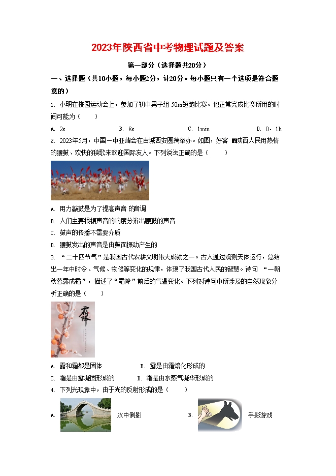 【内容简介】一、选择题(共10小题,每小题2分,计20分。每小题只有一个选项是符合题意的)1. 小明在校园运动会上,参加了初中男子组50m短跑比赛。他正常完成比赛所用的时间可能为( )A. 2sB. 8sC. 1minD. 0.1h2. 2023年5月,中国—中亚峰会在古城西安圆满举办。如图,好客 陕西人民用热情的腰鼓、欢快的秧歌来欢迎国际友人。下列说法正确的是( ) A. 用力敲鼓是为了提高声音 音调B. 人们主要根据声音的响度分辨出腰鼓的声音C. 鼓声的传播不需要介质D. 腰鼓发出的声音是由鼓面振动产生的3. “二十四节气”是我国古代农耕文明伟大成就之一。古人通过观测天体运行,总结出一年中时令、气候、物候等变化的规律,体现了我国古代人民的智慧。诗句“一朝秋暮露成霜”,描述了“霜降”前后的气温变化。下列对诗句中所涉及的自然现象分析正确的是( ) A. 露和霜都是固体 B. 露是由霜熔化形成的C. 霜是由露凝固形成的 D. 霜是由水蒸气凝华形成的4. 下列光现象中,由于光的反射形成的是( )A. 水中倒影B. 手影游戏C. 海市蜃楼D. 雨后彩虹5. 镁合金被誉为“21世纪绿色工程材料”,其密度仅有钢铁的四分之一,还具有强度高、导电性好、耐腐蚀等特性。下列物体不适合用该材料制作的是( )A. 自行车的车架B. 平板电脑外壳C. 起重机配重D. 仪器中 电子元件6. 在2023苏迪曼杯世界羽毛球混合团体锦标赛决赛中,中国队以 力克对手取得胜利,实现了三连冠。如图,是比赛的精彩瞬间。下列说法正确的是( )