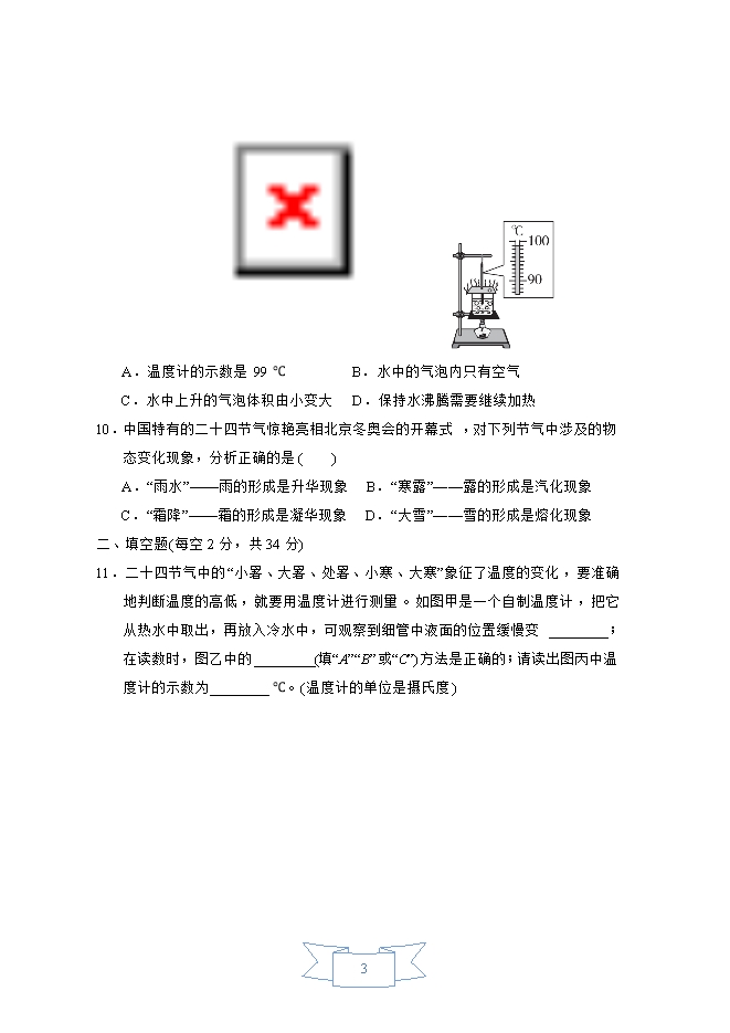 【内容简介】1.正在发烧的小军的体温可能是( )A.35 ℃ B.36 ℃ C.39 ℃ D.49 ℃2.下列关于蒸发和沸腾的说法不正确的是( )A.蒸发和沸腾都需要吸热B.蒸发和沸腾都可以在任何温度下进行C.蒸发和沸腾都属于汽化现象D.沸腾比蒸发现象更剧烈3.寒冷的清晨,一杯冒着“白气”的热茶,温暖了我们的手,也温暖了我们的心。关于“白气”产生涉及的物态变化有( )A.升华和凝华 B.升华和液化 C.汽化和熔化 D.汽化和液化4.天宫课堂上,王亚平老师将一个液体球“变”成了固体球。这一过程中发生的物态变化和吸放热情况是( )A.熔化,吸热 B.凝固,放热 C.液化,吸热 D.凝华,放热5.如图所示,甲、乙分别是酒精在标准大气压下熔化和沸腾时温度随时间变化的图像,下列说法正确的是( )A.固态酒精是非晶体 B.在-117 ℃时,酒精处于液态C.酒精在沸腾过程中吸热但温度不变 D.酒精温度计可以用来测量沸水的温度6.如图所示的自然现象中,属于汽化现象的是( )7.下列物态变化现象中属于升华的是( ) 8.北方寒冷的冬天,机动车要使用防冻液,与水相比,防冻液不易凝固也不易沸腾,这是因为( )A.防冻液的凝固点比水高,沸点比水低 B.防冻液的凝固点比水低,沸点比水高C.防冻液的凝固点比水低,沸点比水低 D.防冻液的凝固点比水高,沸点比水高