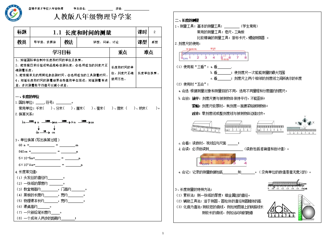 盘锦市育才学校八年级上学期物理导学案:1.1 长度和时间的测量