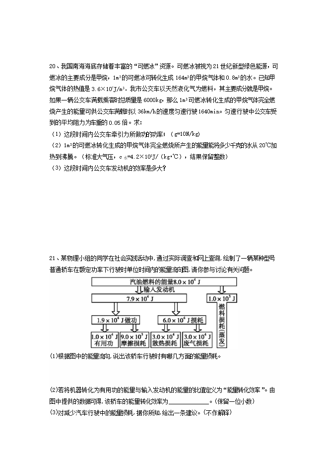 【内容简介】1、一物体在沿粗糙的斜面匀速下滑的过程中 ( ) A.物体的动能转化为重力势能 B.物体的重力势能转化为动能C.物体的机械能保持不变 D.物体的机械能转化为内能2、关于热机错误的说法是( ) A. 利用内能来做功的机器叫热机 B. 一切热机的工作过程都包括四个冲程C. 蒸汽机、内燃机、燃气轮机、喷气发动机都叫热机D. 用来做有用功的那部分能量和燃料完全燃烧放出的能量之比叫做热机的效率3、发射卫星的火箭常使用液态氢作为燃料,主要是因为液态氢具有( )A.较小的密度 B.较大的比热容 C.较高的热值 D.较低的沸点4、关于燃料的热值,以下说法中正确的是( ) A.燃料的热值与燃料的种类有关系,与燃料的质量和燃烧状况无关B.燃烧1千克某种燃料放出的热量叫这种燃料的热值C.燃料燃烧时,质量越大,热值越大 D.燃料不完全燃烧时的热值比完全燃烧时的热值小5、汽油机飞轮的转速是3000 r/min,则可知每分钟内一个汽缸里燃气推动活塞做功的次数是( )A.1500次 B.3000次 C.6000次 D.750次