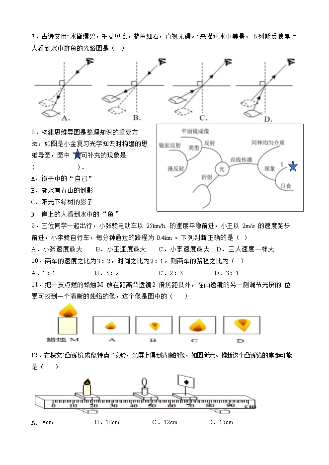 【内容简介】一.选择题(本大题共 14 小题,每小题 2 分,共 28 分。每小题只有一个选项符合题意) 1、“常锻炼”“勤洗手”“要消毒”及“戴口罩”等措施可以有效防止病毒的传播。下列对这些措施中相关数据的估测,不符合实际的是( )A.“常锻炼”:初中生完成八百米跑的时间约 3min25s B.“勤洗手”:每次洗手时间应不少于 20s C.“要消毒”:一张消毒湿巾厚度约为 1nm D.“戴口罩”:一只医用外科口罩长度约为 15cm2、如图所示,在测量硬币直径时,正确的做法是( )3、古诗《春夜洛城闻笛》中有“谁家玉笛暗飞声,散入春风满洛城”,诗人辨别出是玉笛的声音,是依据声音的( )A.音调 B.响度 C.频率 D.音色4、如图所示的现象中,由光的折射形成的是( ) A.屏上的皮影 B.日环食 C.水里的“折筷” D.镜中的花瓶5、别总以为植物“默默无语”,以色列特拉维夫大学研究人员于 2023 年 3 月 30 日在发布的研究报告中指出,植物也会发声,甚至在缺水或承受其他压力时发出更多声音。用能扩音的装置录音,研究人员能捕捉到频率 40 千赫兹至 80 千赫兹的声波。人无法直接听到的原因是植物发出声波的( )A.振幅小、频率高 B.振幅大、频率低 C.音色好、频率高 D.音色差、频率低6、光污染是当代社会四大污染之一一,下列现象中会造成光污染的是( )A. 晚上学习时用护眼灯 B. 在十字路口的大型建筑物上面,大面积安装玻璃幕墙C. 汽车的前挡风玻璃上贴防晒膜 D. 用塑料薄膜建造温室大棚 7、古诗文用“水皆缥碧,千丈见底,游鱼细石,直视无碍。”来描述水中美景,下列能反映岸上人看到水中游鱼的光路图是( ) 8、构建思维导图是整理知识的重要方法,如图是小金复习光学知识时构建的思维导图,图中 处可补充的现象是( ). A.镜子中的“自己” B.湖水有青山的倒影 C.阳光下绿树的影子 D. 岸上的人看到水中的“鱼” 9、三位同学一起出行,小张骑电动车以 25km/h 的速度平稳前进,小王以 2