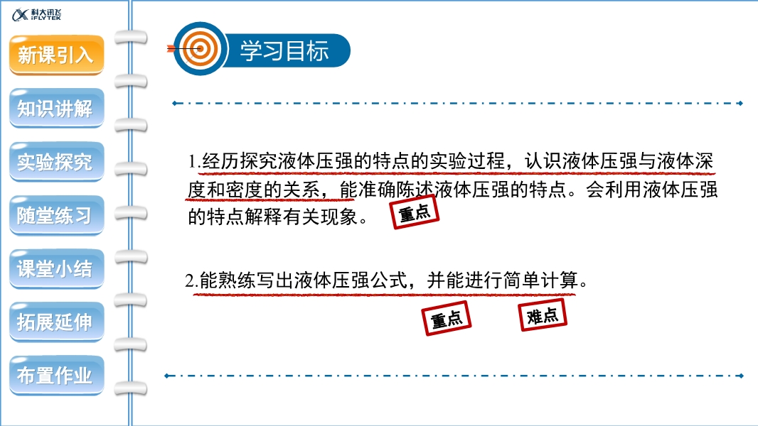 【内容简介】【ppt3】展示图片提问:为什么水坝要建造成上窄下宽?【ppt4】展示图片提问:为什么潜水员在不同深度的水中,需要穿抗压能力不同的潜水服?【ppt5】展示图片、视频,观察实验现象,逐步引出液体压强产生原因:液体受重力;液体具有流动性【ppt6】演示实验通过演示实验或观看实验视频,引出问题:液体内部是否存在压强?液体内部压强的大小有什么特点呢? 液体的压强与哪些因素有关呢?【ppt7】介绍所需实验器材—微小压强计,初步了解压强计的结构、工作原理和使用方法及注意事项学生尝试设计实验,请部分同学给出自己的实验思路【ppt8】