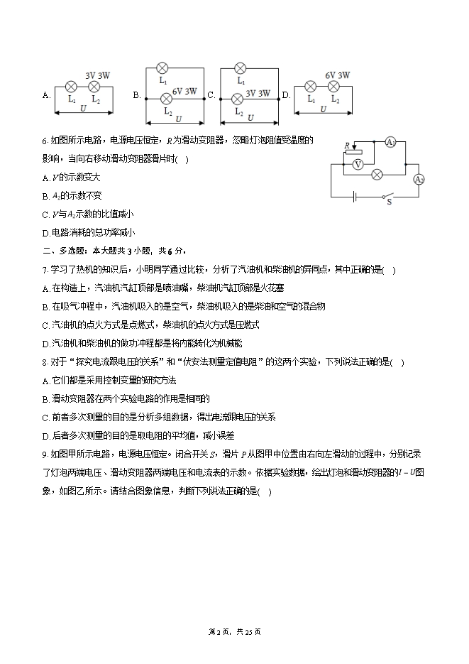 【内容简介】1.“估测”是学习物理必备的能力,小明同学对以下相关物理量的估测合理的是( )A. 家用台灯的工作电流约为0.1A B. 家用电饭锅的额定功率为100WC. 家用空调工作10h消耗电能约100kW⋅h D. 一节铅蓄电池电压约为36V2.春节期间,学校开展了“寻根同源,记住年味”的活动,如图所示是同学们晒的“年味”照片,下列描述正确的是( ) A. 图甲中,玉润饱满的粘豆包温度升高时,内能不变B. 图乙中,刚出锅的回头入嘴时很烫,是因为回头含有的热量很高C. 图丙中,制作“糖画”时糖粘在玻璃板上,说明分子之间只有引力D. 图丁中,刚煮好的豆浆我们在厨房以外的房间可以闻到香味,这是扩散现象3.在气候干燥的冬天,化纤外套与毛质内衣由于摩擦而紧贴在一起。对这种现象解释正确的是( )A. 外套与内衣由于摩擦带有等量同种电荷 B. 外套与内衣由于摩擦使电荷发生了转移C. 两者紧贴的原因与验电器工作原理相同 D. 外套与内衣由于摩擦,创造了新的电荷4.中国一位“95后”年轻科学家发现:当两层石墨烯以一个“魔角”扭曲在一起时,就能在零电阻下导电。这一发现为超导研究打开了一扇新的大门,可能成为常温超导体研究的里程碑。你认为常温下的超导体最适合用来做( )A. 传输电能的导线 B. 电烤箱的电热丝C. 滑动变阻器的电阻线 D. 保险丝5.将灯L_1接在电压为U=3V的电路中,功率为6W。若保持电压U不变,再在电路中连入灯L_2,其灯泡上标示的数字如图所示,使电路的总功率为9W。在如图所示的四个电路中,连接正确的是( )