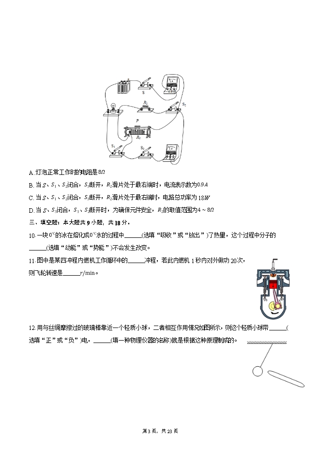 【内容简介】1.关于热现象,下列说法正确的是( )A. 热值大的燃料完全燃烧,放出的热量一定多B. 对物体做功,物体内能一定增大C. 物体的内能增加,可能是从外界吸收了热量D. 热量总是从内能大的物体向内能小的物体传递2.关于热机,下列说法正确的是( )A. 热机是利用化学能做功的机械 B. 内燃机是燃料在汽缸内燃烧的热机C. 内燃机的效率比蒸汽机的低 D. 增大热机的功率,可以提高热机的效率3.下列选项中,能用如图所示的图象表示的是( )A. 探究电流与电阻关系的实验中,变阻器接入阻值R_1与定值电阻R的关系B. 探究影响电阻大小的因素实验中,定值电阻R和它两端电压U的关系C. 探究燃料的热值实验中,某种燃料的热值q与燃料质量m的关系D. 探究物质的吸热能力实验中,某种物质的比热容c与物体质量m的关系4.关于物体的导电性能,下列说法正确的是( )A. 导体能够导电是因为导体内有大量的自由电子存在B. 绝缘体不容易导电,是因为绝缘体内没有自由电荷C. 电加热器的发热体部分使用超导材料可以降低电能损耗D. 导电性能介于导体和绝缘体之间的材料称做半导体5.如图甲所示的电路中,电源电压保持不变,R_0为定值电阻,R为滑动变阻器。闭合开关S,移动滑片P,滑动变阻器消耗的电功率与电流关系的图象如图乙所示,则下列说法正确的是( )