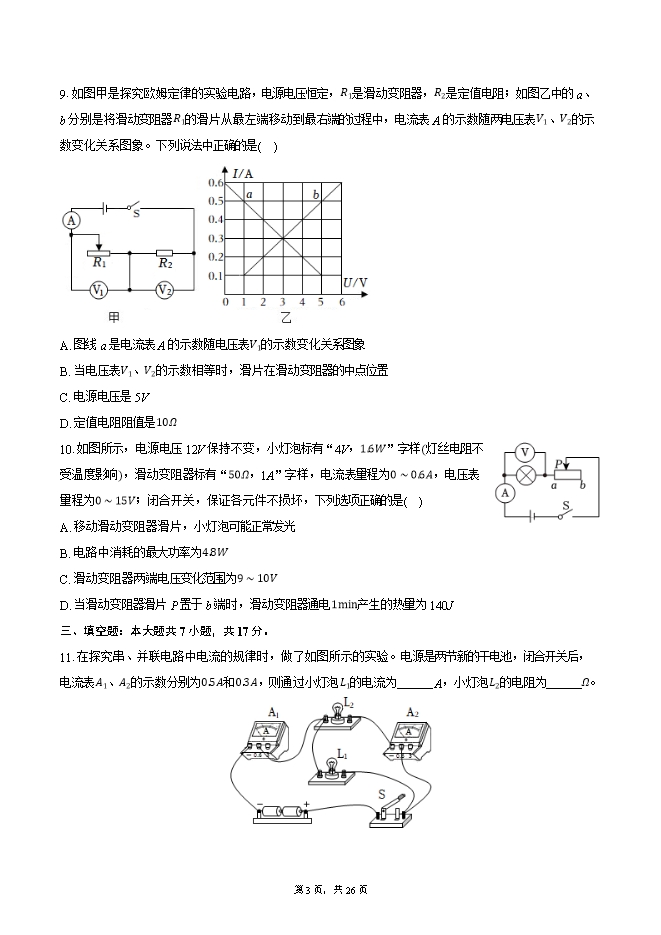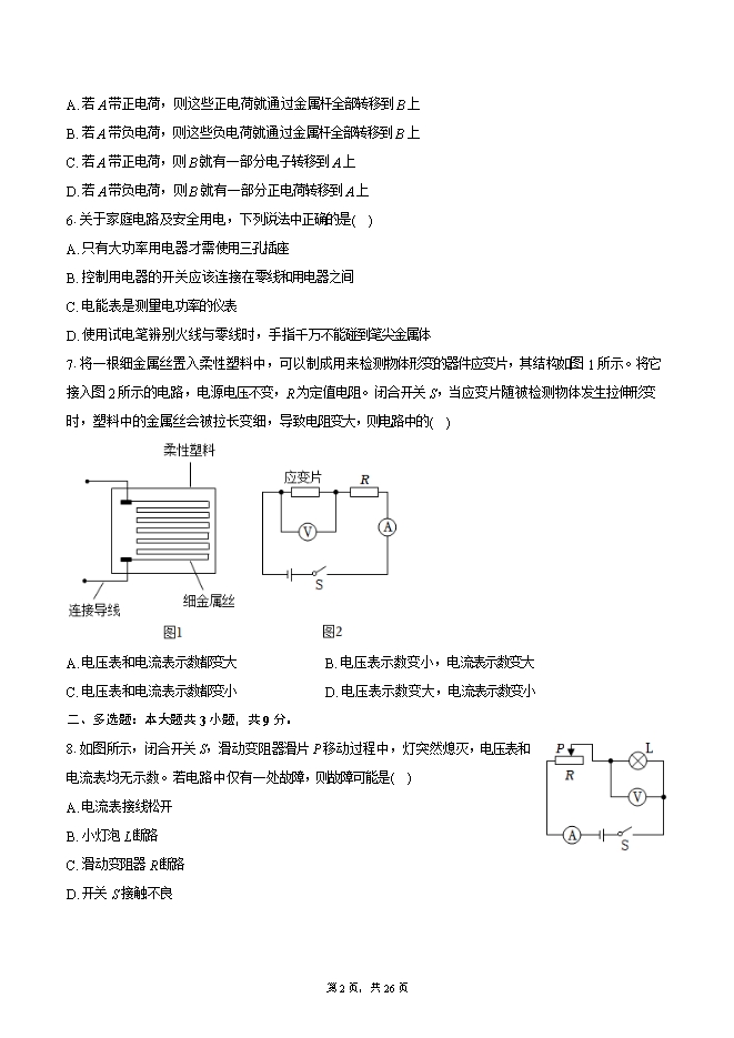 【内容简介】1.以下家用电器的有关数据最符合实际的是( )A. 电冰柜的额定功率为1W B. 电炉丝的额定电流为0.01mAC. 电热水壶的额定电压为36V D. 电视机的额定电压为220V2.如图,下列有关磁现象的说法错误的是( ) A. 如图甲,磁体周围的磁感线是真实存在的B. 如图乙,条形磁体两端磁性强、中间磁性弱C. 如图丙,地理的两极和地磁的两极并不重合D. 如图丁,司南静止时长柄指向南方是受地磁场的作用3.灯泡中有电流时,灯泡发光。关于这个过程中的能量转化,下列说法正确的是( )A. 灯泡消耗的电能全部转化成了光能B. 因为消耗电能,流过灯泡后的电流变小了C. 电流做了多少功,电路中就消耗了多少电能D. 光能最终消失了,没有转化成其他形式的能量4.党的二十大报告指出“科技是第一生产力”。某学校为了培养学生的科学素养,组织科技创新大赛,小明在比赛中制作了水位自动报警器,原理图如图所示。当水位达到金属块A时(一般的水都能导电),则( )A. 两灯都亮 B. 两灯都不亮 C. 只有绿灯亮 D. 只有红灯亮5.取两个相同的验电器A和B,使A带电,B不带电,用带绝缘柄的金属棒把A和B连接起来,如图所示,可观察到A金属箔的张角变小,B金属箔的张角变大,则( )A. 若A带正电荷,则这些正电荷就通过金属杆全部转移到B上B. 若A带负电荷,则这些负电荷就通过金属杆全部转移到B上C. 若A带正电荷,则B就有一部分电子转移到A上D. 若A带负电荷,则B就有一部分正电荷转移到A上6.关于家庭电路及安全用电,下列说法中正确的是( )A. 只有大功率用电器才需使用三孔插座B. 控制用电器的开关应该连接在零线和用电器之间C. 电能表是测量电功率的仪表D. 使用试电笔辨别火线与零线时,手指千万不能碰到笔尖金属体7.将一根细金属丝置入柔性塑料中,可以制成用来检测物体形变的器件应变片,其结构如图1所示。将它接入图2所示的电路,电源电压不变,R为定值电阻。闭合开关S,当应变片随被检测物体发生拉伸形变时,塑料中的金属丝会被拉长变细,导致电阻变大,则电路中的( )