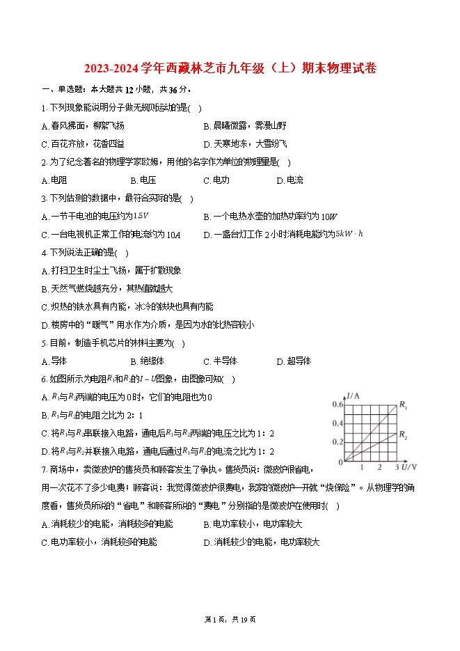 【内容简介】1.下列现象能说明分子做无规则运动的是( )A. 春风拂面,柳絮飞扬 B. 晨曦微露,雾漫山野C. 百花齐放,花香四溢 D. 天寒地冻,大雪纷飞2.为了纪念著名的物理学家欧姆,用他的名字作为单位的物理量是( )A. 电阻 B. 电压 C. 电功 D. 电流3.下列估测的数据中,最符合实际的是( )A. 一节干电池的电压约为1.5V B. 一个电热水壶的加热功率约为10WC. 一台电视机正常工作的电流约为10A D. 一盏台灯工作2小时消耗电能约为5kW⋅h4.下列说法正确的是( )A. 打扫卫生时尘土飞扬,属于扩散现象B. 天然气燃烧越充分,其热值就越大C. 炽热的铁水具有内能,冰冷的铁块也具有内能D. 楼房中的“暖气”用水作为介质,是因为水的比热容较小5.目前,制造手机芯片的材料主要为( )A. 导体 B. 绝缘体 C. 半导体 D. 超导体6.如图所示为电阻R_1和R_2的I-U图象,由图象可知( )A. R_1与R_2两端的电压为0时,它们的电阻也为0B. R_1与R_2的电阻之比为2:1C. 将R_1与R_2串联接入电路,通电后R_1与R_2两端的电压之比为1:2D. 将R_1与R_2并联接入电路,通电后通过R_1与R_2的电流之比为1:27.商场中,卖微波炉的售货员和顾客发生了争执。售货员说:微波炉很省电,用一次花不了多少电费;顾客说:我觉得微波炉很费电,我家的微波炉一开就“烧保险”。从物理学的角度看,售货员所说的“省电”和顾客所说的“费电”分别指的是微波炉在使用时( )A. 消耗较少的电能,消耗较多的电能 B. 电功率较小,电功率较大C. 电功率较小,消耗较多的电能 D. 消耗较少的电能,电功率较大