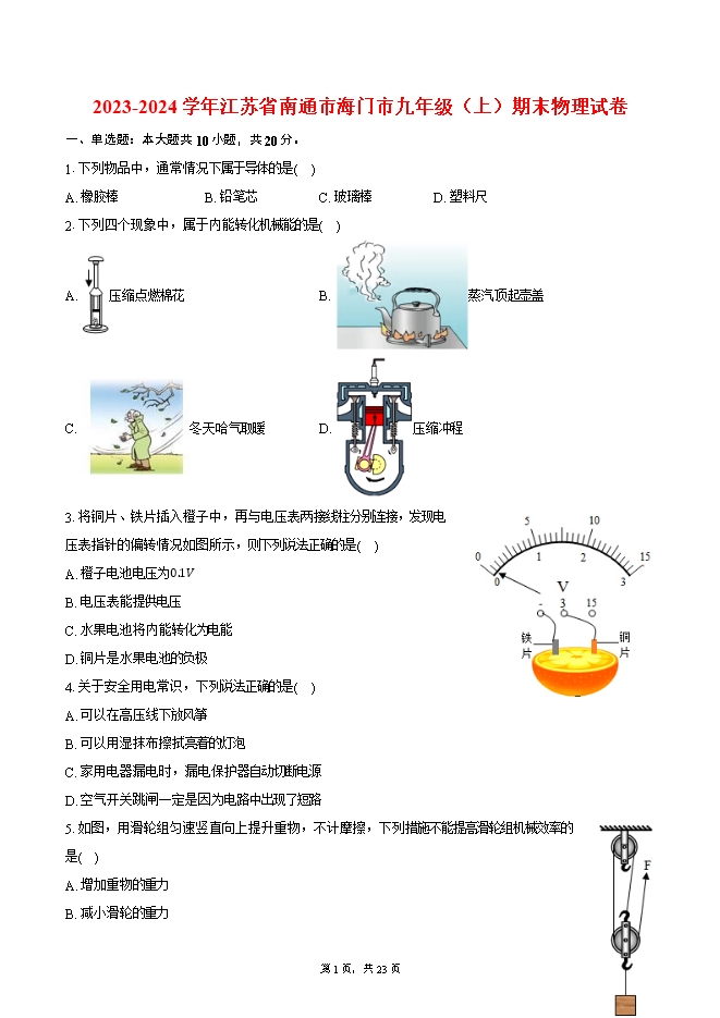 【内容简介】1.下列物品中,通常情况下属于导体的是( )A. 橡胶棒 B. 铅笔芯 C. 玻璃棒 D. 塑料尺2.下列四个现象中,属于内能转化机械能的是( )A. 压缩点燃棉花 B. 蒸汽顶起壶盖C. 冬天哈气取暖 D. 压缩冲程3.将铜片、铁片插入橙子中,再与电压表两接线柱分别连接,发现电压表指针的偏转情况如图所示,则下列说法正确的是( )A. 橙子电池电压为0.1VB. 电压表能提供电压C. 水果电池将内能转化为电能D. 铜片是水果电池的负极4.关于安全用电常识,下列说法正确的是( )A. 可以在高压线下放风筝B. 可以用湿抹布擦拭亮着的灯泡C. 家用电器漏电时,漏电保护器自动切断电源D. 空气开关跳闸一定是因为电路中出现了短路5.如图,用滑轮组匀速竖直向上提升重物,不计摩擦,下列措施不能提高滑轮组机械效率的是( )A. 增加重物的重力B. 减小滑轮的重力C. 减小绳子的重力D. 减少绳子的股数