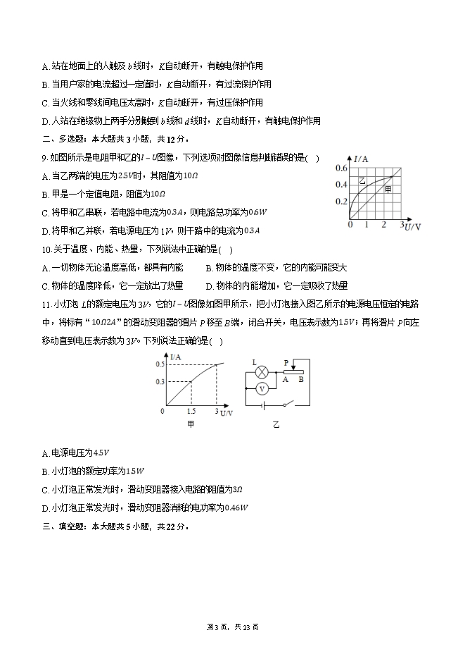 【内容简介】1.在1个标准大气压下,1kg100^℃的水完全汽化成100^℃的水蒸气,需要吸收2.26×10^6 J热量。若保持1个标准大气压的条件下把100g16^℃的水加热沸腾,并使其中的20g汽化,一共需要吸收的热量是水的比热容4.2×10^3 J/(kg⋅^℃)( )A. 3.5×10^4 J B. 4.5×10^4 J C. 8.0×10^4 J D. 7.3×10^4 J2.如图所示,在试管内装适量的水,用软木塞塞住管口,加热一段时间后,软木塞就会被冲出去。以下对于各个过程的解释中错误的是( )A. 酒精燃烧:化学能转化为内能B. 试管内水温升高:燃烧产生的内能全部被水吸收C. 木塞被冲出去:水蒸气对木塞做功,木塞的机械能增加D. 管口出现水雾:水蒸气对外做功,内能减少,温度降低,水蒸气液化成小水滴3.发电机和电动机的相继问世使人类社会进入电气时代.下列四幅图中与发电机工作原理相同的是( )A. B. C. D. 4.如图所示的四种情境,说法不正确的是( ) A. 甲图:用丝绸摩擦过的两根玻璃棒靠近时,会相互排斥B. 乙图:用带有绝缘柄的铜棒把带电的验电器A和不带电的验电器B连接起来,B的金属箔会张开C. 丙图:原本发光的灯L_1 和L_2,用一根导线接触 L_2 两端,会发现L_2不再发光D. 丁图:图中自由电子定向移动的方向为导线中电流的方向5.在如图的电路中,电源电压保持不变,R_0为定值电阻,滑动变阻器R的最大阻值为R_M,移动滑动变阻器的滑片P从A端到B端,滑动变阻器的电功率随电流表示数变化的完整图线如图,图线中a、b两点对应的电功率均为P_1,且c点对应的是滑动变阻器的最大电功率P_2,且P_1:P_2=3:4,则图线中b点对应的电路状态中,滑动变阻器接入电路中的电阻大小( )