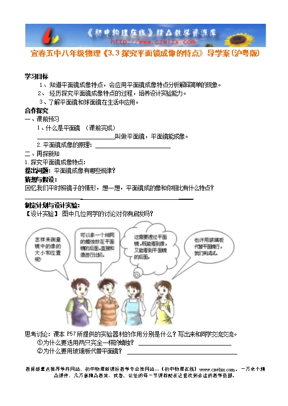 宜春五中八年级物理《3.3探究平面镜成像的特点》导学案(沪粤版)