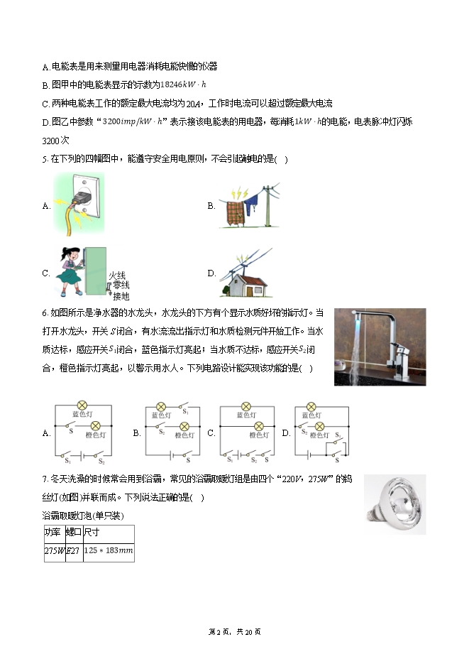 【内容简介】1.以下四件家用电器正常工作时电流最接近1A的是( )A. 家用空调 B. 家用电视机 C. 节能台灯 D. 微波炉2.如图所示,下列日常生活中的用电器,利用电流的热效应工作的是( )A. LED台灯 B. 笔记本电脑C. 电饭煲 D. 电视机3.下列实例中,属于内能转化为机械能的是( )A. 搓手取暖 B. 瓶塞冲出C. 压缩气体 D. 钻木取火4.观察力是物理学科素养的第一要素。如图所示,是生活中常见的两种型号电能表,关于电能表的认识,下列说法正确的是( ) A. 电能表是用来测量用电器消耗电能快慢的仪器B. 图甲中的电能表显示的示数为18246kW⋅hC. 两种电能表工作的额定最大电流均为20A,工作时电流可以超过额定最大电流D. 图乙中参数“3200imp/kW⋅h”表示接该电能表的用电器,每消耗1kW⋅h的电能,电表脉冲灯闪烁3200次5.在下列的四幅图中,能遵守安全用电原则,不会引起触电的是( )A. B. C. D. 6.如图所示是净水器的水龙头,水龙头的下方有个显示水质好坏的指示灯。当打开水龙头,开关S闭合,有水流流出指示灯和水质检测元件开始工作。当水质达标,感应开关S_1闭合,蓝色指示灯亮起;当水质不达标,感应开关S_2闭合,橙色指示灯亮起,以警示用水人。下列电路设计能实现该功能的是( )