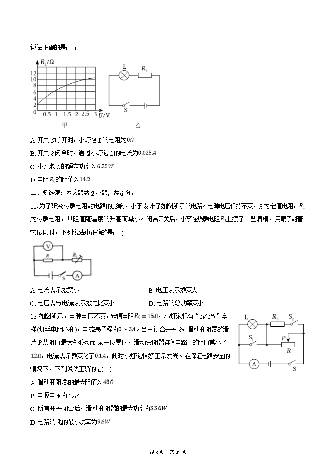 【内容简介】1.下列现象与分子热运动有关的是( )A. 春天,百花争艳 B. 夏天,波光粼粼 C. 秋天,丹桂飘香 D. 冬天,大雪纷飞2.下列关于功、内能、热量的描述正确的是( )A. 机械能为零的物体,内能也一定为零B. 热量总是从内能大的物体向内能小的物体传递C. 做功和热传递都能改变物体的内能D. 物体的内能增大,温度一定升高3.如图所示常用智能手机是通过指纹开关S_1或密码开关S_2来解锁的,若其中任一方式解锁失败后,锁定开关S_3均会断开而暂停手机解锁功能,S_3将在一段时间后自动闭合而恢复解锁功能,若用灯泡L发光模拟手机解锁成功,则符合要求的模拟电路是( )A. B. C. D. 4.如图所示,将两只额定电压相同的小灯泡L_1、L_2串联在电路中,闭合开关后,发现灯L_1较暗,灯L_2较亮,其原因是( ) A. 灯L_2的电流较大 B. 灯L_2的电阻较小C. 灯L_2额定功率较小 D. 灯L_2的额定功率较大5.家用电器中,如每天正常工作接近一小时(一个月按照30天计算),一个月耗电最接近30kW⋅h的是( )A. 电扇 B. 台灯 C. 电热水器 D. 电视机6.如图所示的电路中,闭合开关S后,电流表A_1的示数为0.2A,电流表A_2的示数为 0.8A,此时,电阻R_1和R_2消耗的功率之比是( )A. 1:3 B. 3:1 C. 1:4 D. 4:17.如图所示,两个相同透明容器中密封着等量的空气。用该装置探究电流产生的热量与哪些因素有关时,下列说法正确的是( )A. U形管中液高度差越小反映电流产生热量的越多B. 通电后可探究电流产生的热量与电流大小的关系C. 通电后可探究电流产生的热量与电阻大小的关系D. 通电一段时间后,左侧U形管中液面高度差较大