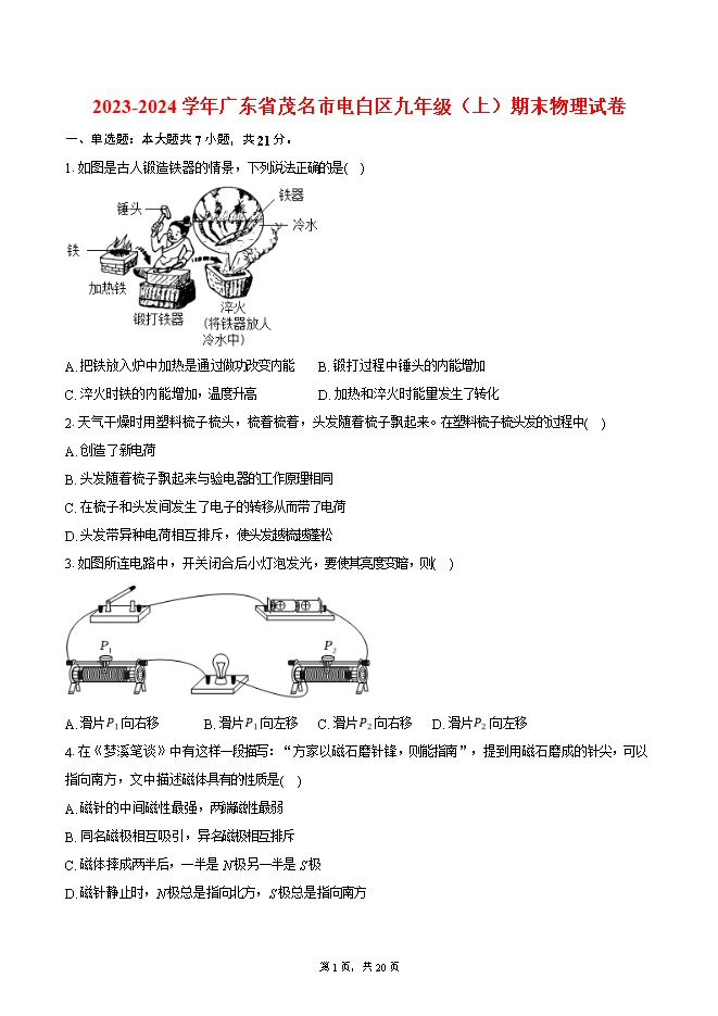 【内容简介】1.如图是古人锻造铁器的情景,下列说法正确的是( ) A. 把铁放入炉中加热是通过做功改变内能 B. 锻打过程中锤头的内能增加C. 淬火时铁的内能增加,温度升高 D. 加热和淬火时能量发生了转化2.天气干燥时用塑料梳子梳头,梳着梳着,头发随着梳子飘起来。在塑料梳子梳头发的过程中( )A. 创造了新电荷B. 头发随着梳子飘起来与验电器的工作原理相同C. 在梳子和头发间发生了电子的转移从而带了电荷D. 头发带异种电荷相互排斥,使头发越梳越蓬松3.如图所连电路中,开关闭合后小灯泡发光,要使其亮度变暗,则( ) A. 滑片P_1 向右移 B. 滑片P_1 向左移 C. 滑片P_2 向右移 D. 滑片P_2 向左移4.在《梦溪笔谈》中有这样一段描写:“方家以磁石磨针锋,则能指南”,提到用磁石磨成的针尖,可以指向南方,文中描述磁体具有的性质是( )A. 磁针的中间磁性最强,两端磁性最弱B. 同名磁极相互吸引,异名磁极相互排斥C. 磁体摔成两半后,一半是N极另一半是S极D. 磁针静止时,N极总是指向北方,S极总是指向南方5.据广西新闻网报道:2010年9月8日晚10时20分许,融水苗族自治县安太乡寨怀村雷雨交加。突然,震耳欲聋的一道迅雷,将村民石庆章屋边直径约30厘米的一棵杉树劈开(如图所示).关于这一现象的解释错误的是( )A. 当雷电击中树木时,强电流通过树身会产生大量的热B. 因树木中含有水分,高温使树木中的水分发生汽化现象C. 高温高压的水蒸气迅速膨胀对树木做功,会将树木劈开D. 树木劈开时由于振动会发出音调很高的声音