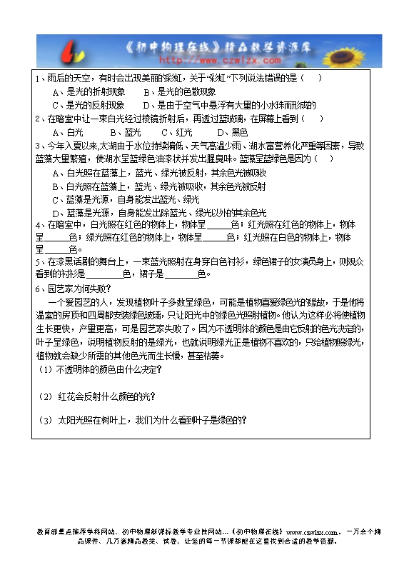 一、 白光能分解成色光吗?阅读课本P79,回答下列问题。1、太阳光通过一个三棱镜后,分解成各种颜色的光,在白屏上形成一条彩色的光带,光带上色光的排列顺序依次是 _______ ,这种现象叫光的 _ 。2、不能再分解的色光叫做___,由单色光混合成的光叫做___。太阳光是___。二、物体的颜色是怎么回事阅读课本P80,回答下列问题。1、 光照射到物体上时,一部分光被物体___,一部分光被物体___。如果物体是透明的,还有一部分光___物体。不同物体对不同色光的___、___和___的情况不同,因而呈现出不同的颜色。2、 光照射到有色透明物体上时,被有色透明物体透过的是_____的光,____的光都被吸收了。所以,透明物体的颜色是由它___的色光决定的。3、 透明物体如果几乎让各种色光都通过,它就是____的。