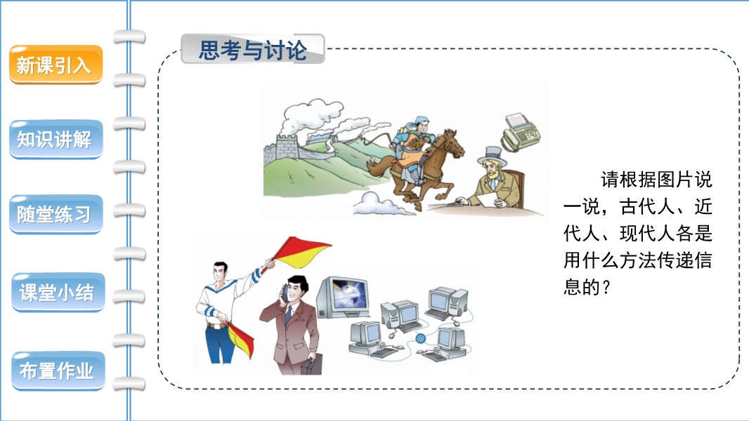【内容简介】【ppt 3】思考与讨论教师出示图片,要求学生根据图片说一说,古代人、近代人、现代人各是用什么方法传递信息的?【ppt 4】视频引入:“顺风耳”的神话传说教师讲解:在我国古代曾经流传有“顺风耳”的神话传说,它反映了人们想要冲破空间的阻隔,互通信息的美好向往。1876年贝尔发明了电话,这一愿望得以实现。100多年来,电话技术有了很大的发展。在现代,我们的生活已经离不开“现代顺风耳”——电话了。【ppt 5】出示课本图21.1-2 电话。教师讲解:最简单的电话由话筒和听筒组成。话筒和听筒之间还要连上一对电话线用来传递信号。话筒的作用是把声音信号转换为强弱变化的电信号(电流)。电话线的作用让电流沿着电话线把信息传到远方。听筒的作用是电流使听筒的膜片振动,把携带信息的电信号转换为声音信号。教师总结:话筒把声音转换为变化的电流;电流沿着电话响传到远方,再通过听筒转换为声音。【板书】一、电流把信息传到远方最简单的电话由话筒和听筒组成。话筒和听筒之间还要连上一对电话线用来传递信号。话筒:把声音信号转换为强弱变化的电信号(电流)。听筒:电流使听筒的膜片振动,把携带信息的电信号转换为声音信号。【ppt 6】出示课本图21.1-3 电话结构示意图。教师结合电话的结构示意图,更加细致的讲解听筒和话筒的工作原理。需要指出,话筒工作时,将机械能转化为电能;听筒工作时,将电能转化为机械能。【ppt 7】想想议议1提出问题:一个地区有5部电话,要使这5部话机中的任意两部都能互相通话,要架设多少对电话线?(要求学生在图甲中把电话线画出来,每对电话线可用一条线代表。)教师给学生思考的时间,然后请学生上讲台画图,并最后给出正确的答案。【ppt 8】想想议议2提出问题:你能否想出一个办法,要尽量减少线路的数量,但仍能保证5部电话中的任意两部可以互相通话(这时其他几部暂不能通话)?请在图乙中把电话线画出来。
