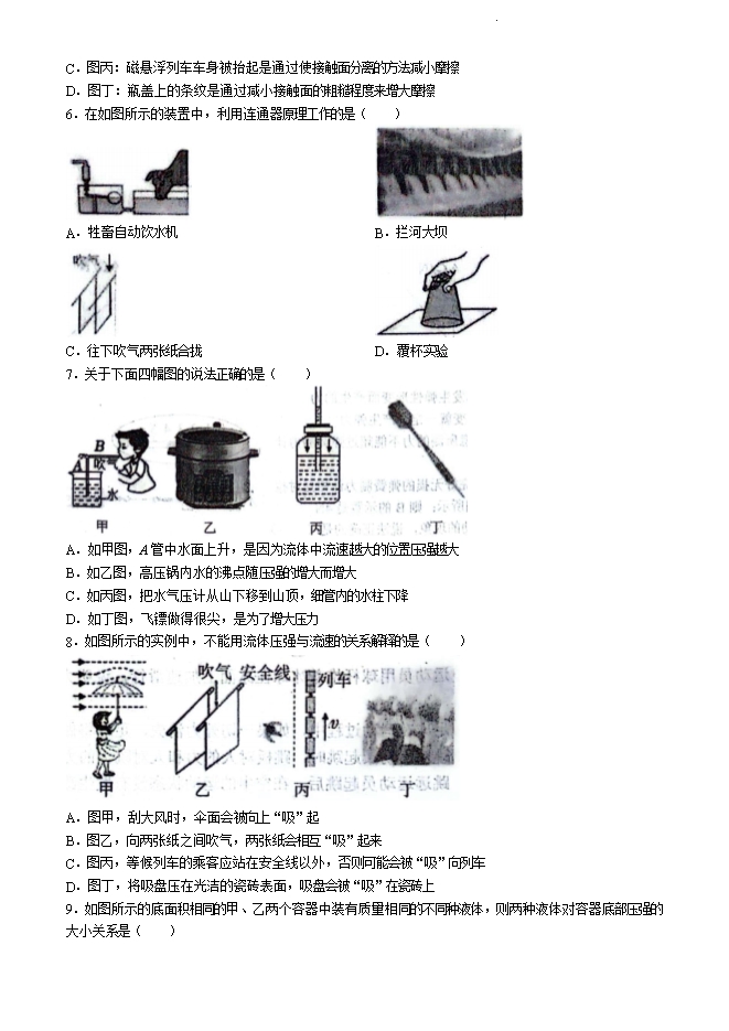 【内容简介】1.生活处处有物理,小杰对下列生活中的物理量进行了估测,最符合实际的是( )A.一名普通中学生的重力约为500N B.学校教学楼的高度约为12dmC.一个鸡蛋的重力约为10N D.泰山山顶上的大气压约为 2.如图所示,小华用矿泉水瓶做实验:他用水平力轻推底部时,瓶子沿桌面平稳地移动;用大小、方向都相同的水平力轻推瓶盖时,瓶子翻了。他验证的是力的作用效果与( ) A.力的方向有关 B.力的大小有关C.力的作用点有关 D.力的大小、方向、作用点都有关3.下列对于有关物理现象或物理知识的描述,正确的是( )A.“一个巴掌拍不响”——说明发生力的作用可以只有一个物体B.“鸡蛋碰石头,自不量力”——说明鸡蛋对石头的力小于石头对鸡蛋的力C.“无风不起浪”——说明力可以改变物体的运动状态D.“人往高处走,水往低处流”——因为水受到重力的作用,方向垂直向下4.下列关于力和运动的说法中正确的是( )A.人站在水平地面上,人受到的重力和支持力是一对平衡力B.推出去的铅球可以在空中继续运动,是因为铅球受到惯性的作用C.鸡蛋磕到碗边上鸡蛋破了,是因为碗对鸡蛋的力大于鸡蛋对碗的力D.驾驶员和乘客系安全带是为了减小惯性5.下列对图中情景的解释,正确的是( ) A.图甲:载重车装有很多车轮是通过增大受力面积来增大压强B.图乙:图钉帽面积做得较大是通过减小受力面积来减小压强C.图丙:磁悬浮列车车身被抬起是通过使接触面分离的方法减小摩擦D.图丁:瓶盖上的条纹是通过减小接触面的粗糙程度来增大摩擦6.在如图所示的装置中,利用连通器原理工作的是( )
