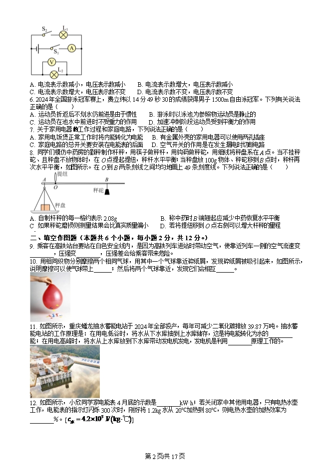 2024年重庆市中考物理试题及答案 A卷(word版)