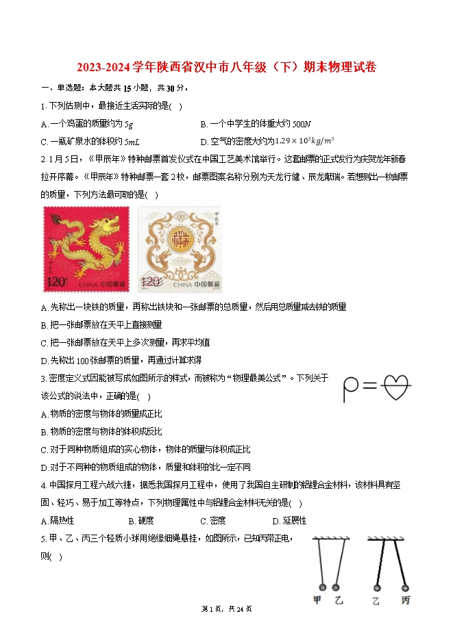 【内容简介】1.下列估测中,最接近生活实际的是( )A. 一个鸡蛋的质量约为5g B. 一个中学生的体重大约500NC. 一瓶矿泉水的体积约5mL D. 空气的密度大约为1.29×10^3 kg/m^32.1月5日,《甲辰年》特种邮票首发仪式在中国工艺美术馆举行。这套邮票的正式发行为庆贺龙年新春拉开序幕。《甲辰年》特种邮票一套2枚,邮票图案名称分别为天龙行健、辰龙献瑞。若想测出一枚邮票的质量,下列方法最可取的是( )A. 先称出一块铁的质量,再称出铁块和一张邮票的总质量,然后用总质量减去铁的质量B. 把一张邮票放在天平上直接测量C. 把一张邮票放在天平上多次测量,再求平均值D. 先称出100张邮票的质量,再通过计算求得3.密度定义式因能被写成如图所示的样式,而被称为“物理最美公式”。下列关于该公式的说法中,正确的是( )A. 物质的密度与物体的质量成正比B. 物质的密度与物体的体积成反比C. 对于同种物质组成的实心物体,物体的质量与体积成正比D. 对于不同种的物质组成的物体,质量和体积的比一定不同4.中国探月工程六战六捷,据悉我国探月工程中,使用了我国自主研制的铝锂合金材料,该材料具有坚固、轻巧、易于加工等特点,下列物理属性中与铝锂合金材料无关的是( )A. 隔热性 B. 硬度 C. 密度 D. 延展性5.甲、乙、丙三个轻质小球用绝缘细绳悬挂,如图所示,已知丙带正电,则( )A. 甲、乙均带正电B. 甲、乙均带负电C. 乙带正电,甲一定带负电D. 乙带正电,甲可能不带电