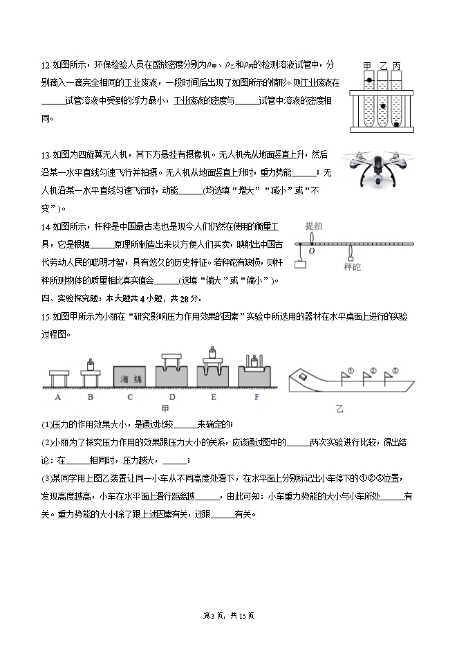 【内容简介】1.如图所示,F1与F2是一对平衡力的是( )A. B. C. D. 2.如图所示,水平桌面上放有底面积和质量都相同的甲、乙两平底容器,分别装有深度相同、质量相等的不同液体。下列说法正确的是( )3.下列简单机械在使用过程中省力的是( )A. 瓶起子 B. 取碗器C. 去核器 D. 食品夹4.小明和小华在沙滩上玩耍时发现:两人在沙滩上行走的脚印大小不同,小明的脚印较大,但两人脚印的深浅相同,则他们对沙滩的压强及压力相比( )二、多选题:本大题共2小题,共6分。5.关于功和功率,下列说法正确的是( )A. 举重运动员举着杠铃不动,人举杠铃的力没有做功B. 小球在粗糙的水平桌面上移动了一段距离,桌面对小球的支持力做了功C. 做功越多的机械功率越大D. 做功越快的机械功率越大6.如图所示,将苹果和梨子放入水中后,苹果漂浮,梨子沉底。若苹果的质量、体积及受到的浮力分别为m_1、V_1和F_1,梨子的质量、体积及受到的浮力分别为m_2、V_2和F_2。以下判断正确的是( )