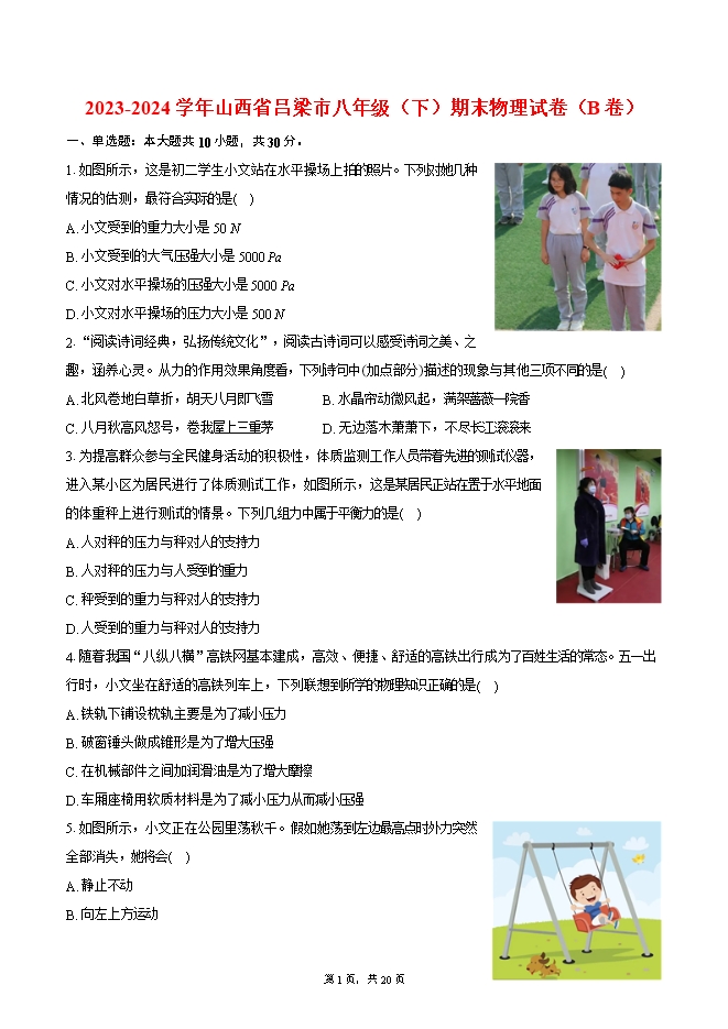 【内容简介】1. 如图所示,这是初二学生小文站在水平操场上拍的照片。下列对她几种情况的估测,最符合实际的是( )A. 小文受到的重力大小是50 NB. 小文受到的大气压强大小是5000 PaC. 小文对水平操场的压强大小是5000 PaD. 小文对水平操场的压力大小是500 N2.“阅读诗词经典,弘扬传统文化”,阅读古诗词可以感受诗词之美、之趣,涵养心灵。从力的作用效果角度看,下列诗句中(加点部分)描述的现象与其他三项不同的是( )A. 北风卷地白草折,胡天八月即飞雪 B. 水晶帘动微风起,满架蔷薇一院香C. 八月秋高风怒号,卷我屋上三重茅 D. 无边落木萧萧下,不尽长江滚滚来3. 为提高群众参与全民健身活动的积极性,体质监测工作人员带着先进的测试仪器,进入某小区为居民进行了体质测试工作,如图所示,这是某居民正站在置于水平地面的体重秤上进行测试的情景。下列几组力中属于平衡力的是( )A. 人对秤的压力与秤对人的支持力B. 人对秤的压力与人受到的重力C. 秤受到的重力与秤对人的支持力D. 人受到的重力与秤对人的支持力4.随着我国“八纵八横”高铁网基本建成,高效、便捷、舒适的高铁出行成为了百姓生活的常态。五一出行时,小文坐在舒适的高铁列车上,下列联想到所学的物理知识正确的是( )A. 铁轨下铺设枕轨主要是为了减小压力B. 破窗锤头做成锥形是为了增大压强C. 在机械部件之间加润滑油是为了增大摩擦D. 车厢座椅用软质材料是为了减小压力从而减小压强