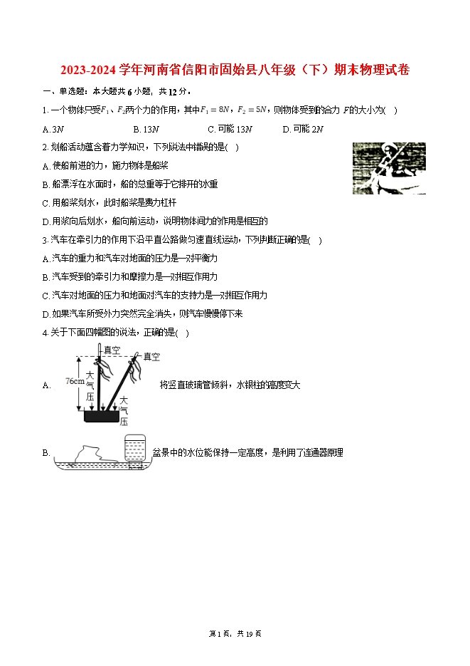 2023-2024学年河南省信阳市固始县八年级(下)期末物理试卷(word版含解析)