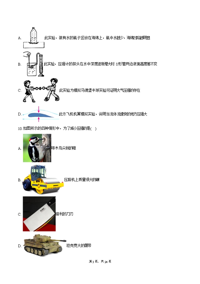 【内容简介】1.在下列各图中,F表示压力的是( )A. B. C. D. 2.关于下列仪器的说法中,错误的是( )A. 弹簧测力计只能测量重力的大小 B. 铅垂线用来检查所砌的墙壁是否竖直C. U形管压强计可以测量液体内部压强 D. 测量大气压的仪器是气压计3.如图所示,有一斜面长为s、高为h,现用力F沿斜面将重力为G的物体从底端匀速拉到顶端,斜面的机械效率为 。则下列关于斜面对物体的摩擦力f的表达式中不正确的是( )A. B. C. D. 4.一辆新能源电动汽车匀速驶上平直斜坡的过程中,牵引力大小保持不变。对于上坡过程中的汽车,下列说法正确的是( )A. 汽车所受力的合力变大 B. 牵引力对车做的功不变C. 汽车的机械能保持不变 D. 汽车输出功率保持不变5.如图所示,“龙吸水”是一种神奇的自然现象。“龙吸水”是龙卷风,是高速旋转的气流,它能“吸”起水的原因是( )A. 龙卷风内部流速大、压强大B. 龙卷风内部流速小、压强小C. 龙卷风内部流速小、压强大D. 龙卷风内部流速大、压强小6.托里拆利实验的规范操作过程,如图所示。关于托里拆利实验,下列说法正确的是( ) A. 玻璃管中装满水银是为了排除管内的空气B. 图中玻璃管倾斜会影响实验测量结果C. 实验时大气压值大于760mm水银柱产生的压强D. 玻璃管的粗细对实验测量结果有影响7.小理在吸管下端夹上燕尾夹,然后将此装置分别置于甲、乙两杯液体中,静止时的情形如图所示,下列说法正确的是( )A. 装置在甲杯液体中受到的浮力较小B. 甲杯液体的密度较小C. 装置在乙杯液体中受到的浮力较小D. 乙杯液体的密度较小