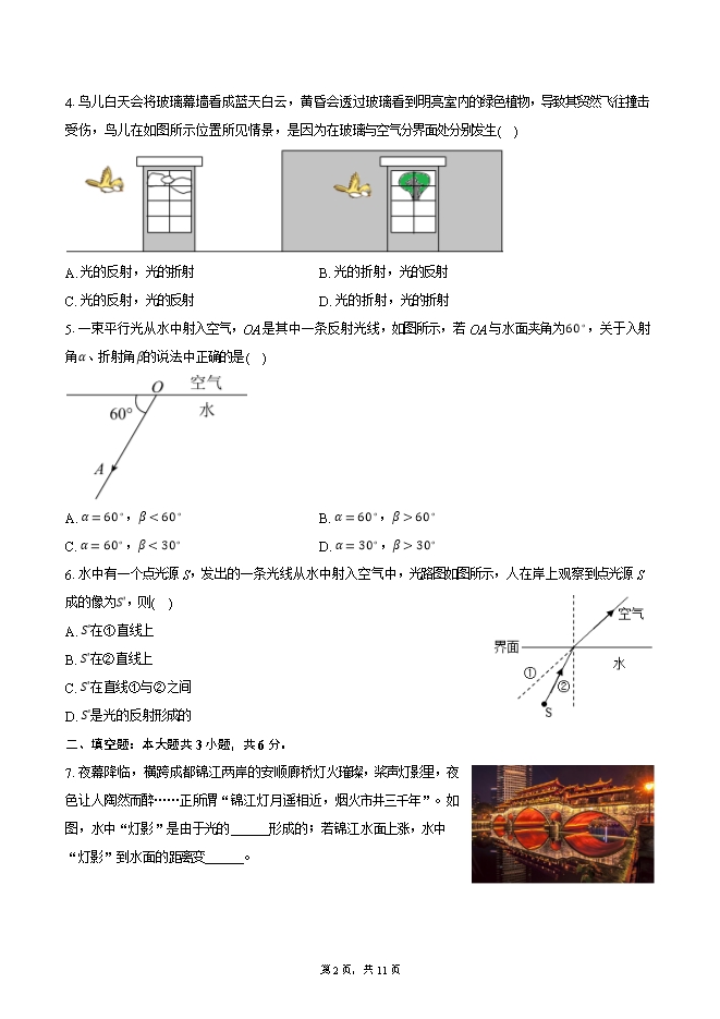 【内容简介】1.红外线和紫外线的应用非常广泛,下列仪器中属于利用紫外线工作的是( )A. 电视机遥控器 B. 夜视仪C. 验钞机 D. 测温仪2.如图所示,水中映出拱桥的倒影,其桥孔与倒影构成了一个圆形,如果桥下的水面上升,桥孔与倒影构成的图形形状是( )A. B. C. D. 3.如图所示,在一个空罐的底部中央打一个孔,再用一片塑料膜蒙在空罐的口上。将小孔对着烛焰,我们可以看到烛焰在薄膜上呈现的像。这个像是( )A. 烛焰的正立像 B. 烛焰的倒立像 C. 正方形光斑 D. 圆形光斑4.鸟儿白天会将玻璃幕墙看成蓝天白云,黄昏会透过玻璃看到明亮室内的绿色植物,导致其贸然飞往撞击受伤,鸟儿在如图所示位置所见情景,是因为在玻璃与空气分界面处分别发生( ) A. 光的反射,光的折射 B. 光的折射,光的反射C. 光的反射,光的反射 D. 光的折射,光的折射5.一束平行光从水中射入空气,OA是其中一条反射光线,如图所示,若OA与水面夹角为60^∘,关于入射角α、折射角β的说法中正确的是( )
