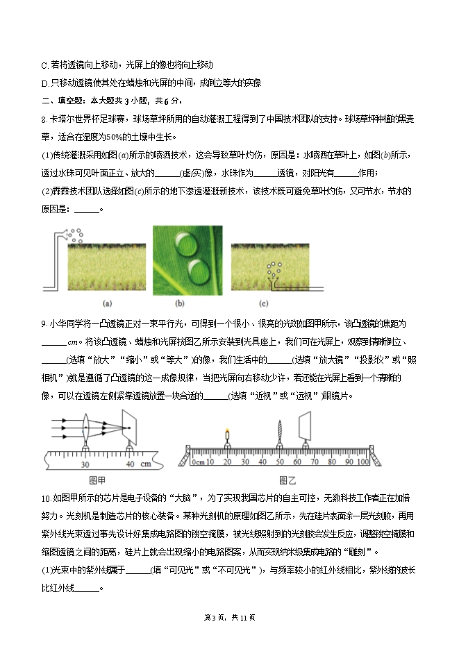 【内容简介】1.下列光路图正确的是( )A. 凸透镜对光线的作用 B. 凹透镜对光线的作用C. 放大镜的成像图 D. 近视眼的成像图2.如图所示,这是一张初三毕业创意照片。利用视觉错位技术一次拍摄而成,不需经过后期再处理。在拍摄过程中,下列说法正确的是( )A. 照相机的镜头与近视镜片为同一类透镜B. 手通过镜头成正立、放大的虚像C. 学生和手到镜头的距离一样D. 学生通过镜头成倒立、缩小的实像3.如图所示是小贺参观河南博物馆时观察到的一件展品,展品的上方有一个透镜,透过它能看到展品放大的像,下列说法正确的是( )A. 展台上放置的是凹透镜 B. 通过该透镜所成的像是正立的虚像C. 该成像原理与投影仪相同 D. 展品放置在透镜的二倍焦距之外4.生活中我们经常可以看到的广告投影灯,其内部结构如图所示。下列说法正确的是( )A. 投影灯的成像原理是光的直线传播B. 投影灯在地面上成的是正立、放大的虚像C. 投影灯到地面的距离应大于镜头的2倍焦距D. 为了在地面上得到更大的广告图像,应使投影灯远离地面,同时凸透镜向外伸5.如图所示,烛焰、凸透镜和光屏三者的中心在同一高度,该凸透镜的焦距为10.0cm,凸透镜的位置保持不变。以下说法正确的是( )A. 当蜡烛放在图中A区域时,光屏应放在图中D区域才可能呈现清晰的像B. 蜡烛从图中位置逐渐远离透镜时,所成的像会逐渐变小C. 若无论怎么移动光屏,在光屏上都找不到像,则蜡烛可能放在图中B区域D. 若光屏上要得到一个放大的像,则蜡烛应该放在图中C区域6.如图所示,小明同学在探究凸透镜成像的规律时,记录并绘制了物距u和像距v之间的关系图象。下列说法正确的是( )