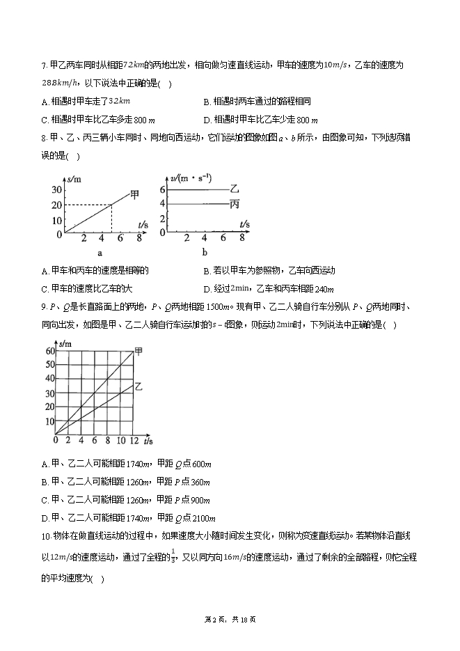 【内容简介】1.晓燕在学校春季运动会百米赛跑中以16 s的成绩获得冠军,测得她在50 m处的速度是6m/s,到终点时的速度为7.5m/s,则她全程内的平均速度是( )A. 6m/s B. 6.25m/s C. 6.75m/s D. 7.5m/s2.甲、乙两物体同时从同一地点沿直线向左运动,它们的s-t图象如图所示,下列说法正确的是 ( ) A. 0∼2s内甲的速度大于乙的速度 B. 2∼4s内乙的速度大于甲的速度C. 4 s时甲、乙两物体的速度相等 D. 4∼5s内以甲为参照物,乙向右运动3.如下图所示,两木块自左向右运动,用高速摄影机在同一底片上多次曝光,记录下木块每次曝光时的位置。已知连续两次曝光的时间间隔是相等的。下列v-t图象中能正确表示两木块运动情况的是 ( ) A. B. C. D. 4.在学校运动会中测量跳高成绩时,应选取合适的测量工具是( )A. 分度值是1 cm的15 m皮卷尺 B. 分度值是1 mm的1.5m钢卷尺C. 分度值是1 mm的米尺 D. 自制一根分度值是1 cm的硬杆长尺5.使用拉长了的软塑料尺测物体的长度,测量的结果将( )A. 比真实值偏大 B. 比真实值偏小 C. 不受影响 D. 和真实值完全一样6.某车站并排行驶着甲、乙两列刚发出的列车,甲车的人看到窗外的电线杆向西运动起来,而乙车的人看见甲车未动,若以地面为参照物,下面说法正确的是( )A. 甲车向东行驶,乙车未动 B. 甲车向东行驶,乙车向西行驶C. 甲车不动,乙车向东行驶 D. 甲、乙两车均以相同的速度向东行驶7.甲乙两车同时从相距7.2km的两地出发,相向做匀速直线运动,甲车的速度为10m/s,乙车的速度为28.8km/h,以下说法中正确的是( )A. 相遇时甲车走了3.2km B. 相遇时两车通过的路程相同C. 相遇时甲车比乙车多走800 m D. 相遇时甲车比乙车少走800 m8.甲、乙、丙三辆小车同时、同地向西运动,它们运动的图象如图 a、b所示,由图象可知,下列选项错误的是( )
