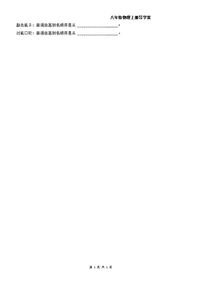 【内容简介】温故而知新1.一切声音都是由物体___________产生的;声音的传播需要介质,____________不能传声。2.声音也叫____________,传播速度与介质的____________和温度有关。2.2《声音的特性》一、学习目标1.知道音调的高低,了解影响音调高低的因素2.知道声音的响度,了解影响响度大小的因素3.知道发声体的材料和结构不同,发声体的音色不同4.知道超声波和次声波都是人耳听不到的声音二、课堂导学1.声音的音调(1)音调:是指声音的________________;音阶:1 2 3 4 5 6 7 1的音调越来越_________;(2)决定音调高低的因素:发声体振动越快,振动___________越高,音调越高;实验:钢尺的长短,决定着钢尺振动的频率高低,决定着_____________的高低;②分析上图中甲乙音叉声音的波形图,________的音调高。③演奏弦乐器时,手指按不同的位置,改变了声音的_____________,琴弦短、紧、细发出声音的音调___________;④吹唢呐和笛子时,手指按不同的孔,改变了声音的_____________,空气柱越短,声音的音调_____________;(3)人耳听不到的声音①人的听觉范围:20Hz ~ 20000Hz②超声波:频率高于____________Hz的声音③次声波:频率低于_________Hz的声音2.声音的响度(1)响度:指声音的______________;实验:用大小不同的力拨动钢尺,决定着钢尺振幅的大小,从而决定着_____________的大小;(2)影响响度大小的因素:①发声体___________越大,响度越大 ②与到声源的距离有关想一想:如图是甲乙丙两种声音的波形图,_______音调高,________响度小;