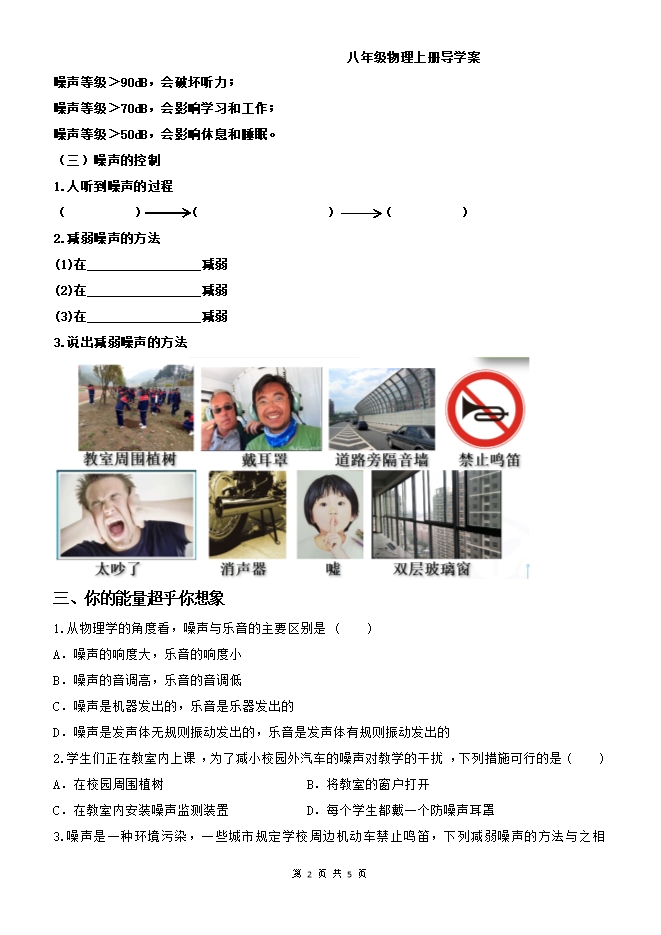 【内容简介】温故而知新1.判断正误(1)物体在真空中振动不会产生声音( )(2)“玉兔号”月球车在月球上靠超声波探测障碍物的( )(3)声音的响度越大,传播速度越快( )(4)敲鼓越用力,鼓声音调越高( )(5)听到上课铃声,同学们都进入教室上课,说明声音能传递信息( )(6)超声波碎石机是利用声音能够传递能量( )(7)“闻声识人”是利用声音的音色不同( )(8)声呐系统可以鱼群的位置,说明声音能够传递能量( )2.弹奏古琴时,手在不同位置按弦,目的是改变声音的 ,用力拨动琴弦是改变声音的___________;用B超检查胎儿的发育情况,说明声可以传递 。2.4《噪声的危害和控制》一、学习目标1.了解生活中的噪声 2.知道噪声的等级和危害 3.了解生活中减弱噪声的方法二、课堂导学(一)乐音和噪声看视频导入新课,感受乐音和噪声不同(二)噪声1.噪声的定义(1)从物理角度定义:物体无规则振动产生的声音。(2)从生活角度定义:凡是妨碍人们正常休息、学习和工作的声音,以及对人们要听的声音产生干扰的声音。2.生活中噪声的来源①建筑工地机器轰鸣声、敲击声 ②装修房屋的电钻声、电锯声 ③大街上叫卖声④汽车的鸣笛声 ⑤晚上休息时,广场舞的舞曲声等3.噪声的等级(1)声音的等级单位:___________;(2)0分贝:是人刚能听到的最微弱的声音(3)噪声强弱的三条界线: