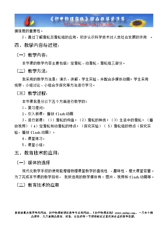 我说课的内容是,北京师范大学出版社,八年级物理第九章第二节《滑轮》。这节课既是对杠杆知识的延伸,又为后面学习“功的原理和机械效率”作准备。所以,本节课在第九章中起到承上启下的重要作用。