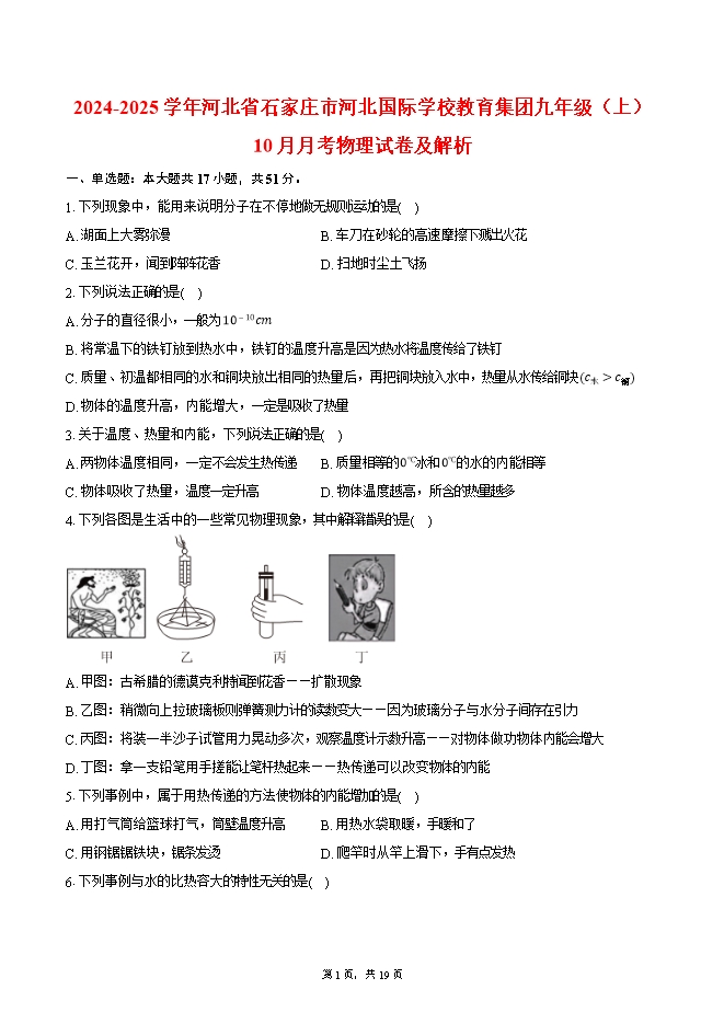 【内容简介】1.下列现象中,能用来说明分子在不停地做无规则运动的是( )A. 湖面上大雾弥漫 B. 车刀在砂轮的高速摩擦下溅出火花C. 玉兰花开,闻到阵阵花香 D. 扫地时尘土飞扬2.下列说法正确的是( )A. 分子的直径很小,一般为10^(-10) cmB. 将常温下的铁钉放到热水中,铁钉的温度升高是因为热水将温度传给了铁钉C. 质量、初温都相同的水和铜块放出相同的热量后,再把铜块放入水中,热量从水传给铜块(c_水>c_铜)D. 物体的温度升高,内能增大,一定是吸收了热量3.关于温度、热量和内能,下列说法正确的是( )A. 两物体温度相同,一定不会发生热传递 B. 质量相等的0^℃冰和0^℃的水的内能相等C. 物体吸收了热量,温度一定升高 D. 物体温度越高,所含的热量越多4.下列各图是生活中的一些常见物理现象,其中解释错误的是( ) A. 甲图:古希腊的德谟克利特闻到花香——扩散现象B. 乙图:稍微向上拉玻璃板则弹簧测力计的读数变大——因为玻璃分子与水分子间存在引力C. 丙图:将装一半沙子试管用力晃动多次,观察温度计示数升高——对物体做功物体内能会增大D. 丁图:拿一支铅笔用手搓能让笔杆热起来——热传递可以改变物体的内能5.下列事例中,属于用热传递的方法使物体的内能增加的是( )A. 用打气筒给篮球打气,筒壁温度升高 B. 用热水袋取暖,手暖和了C. 用钢锯锯铁块,锯条发烫D. 爬竿时从竿上滑下,手有点发热
